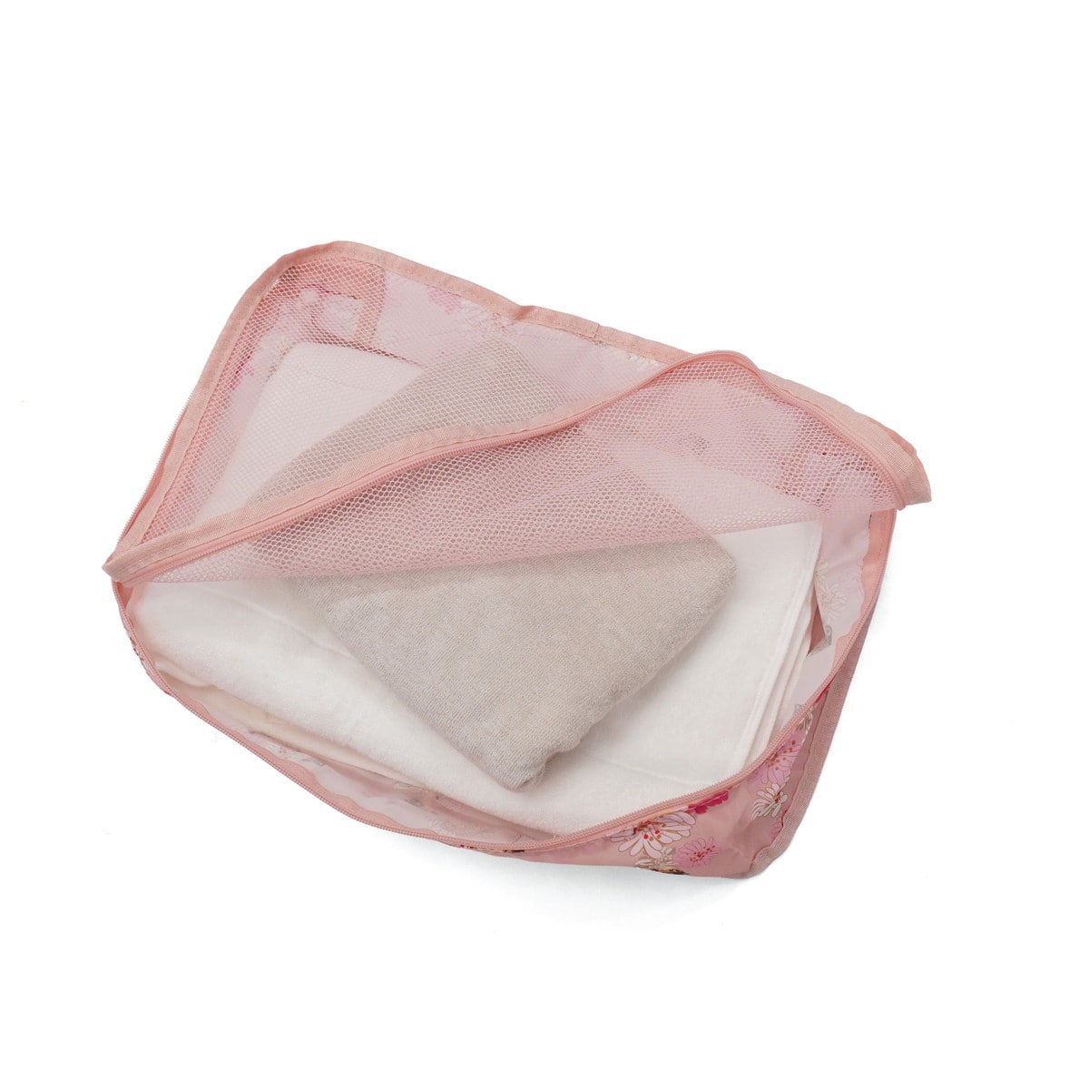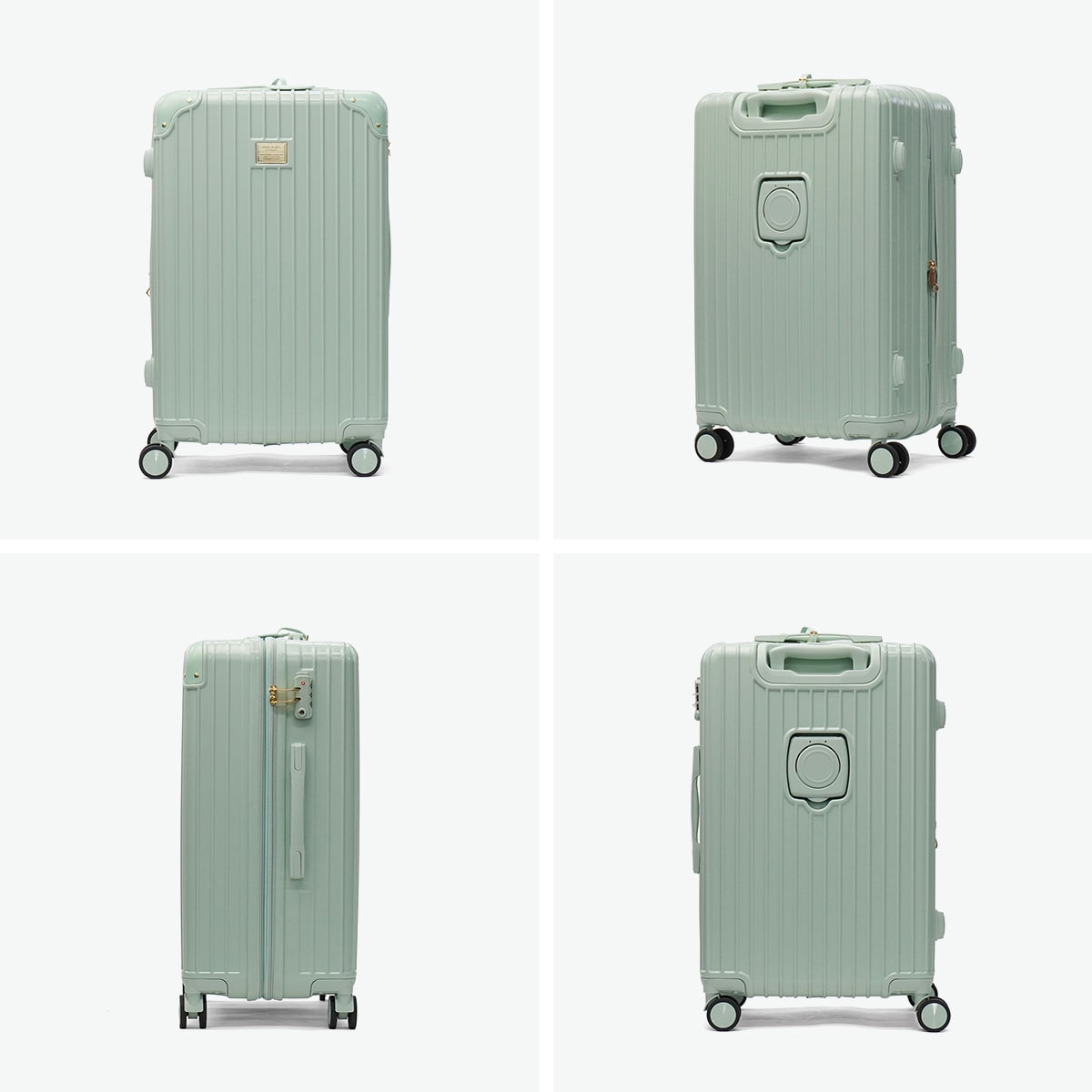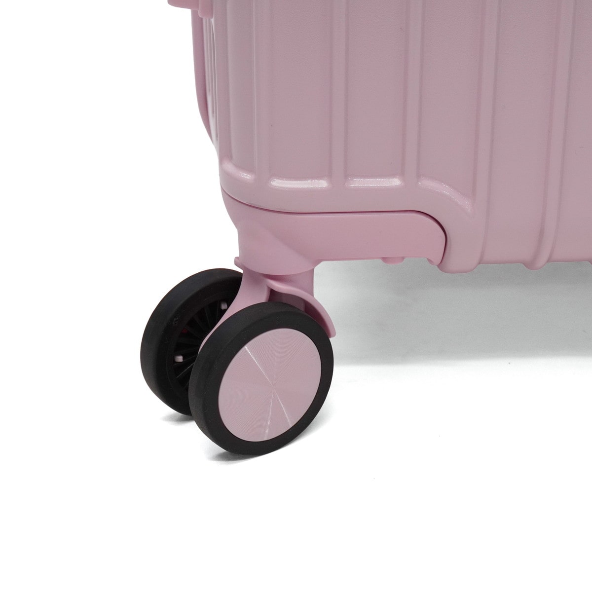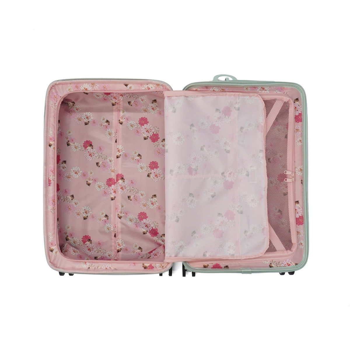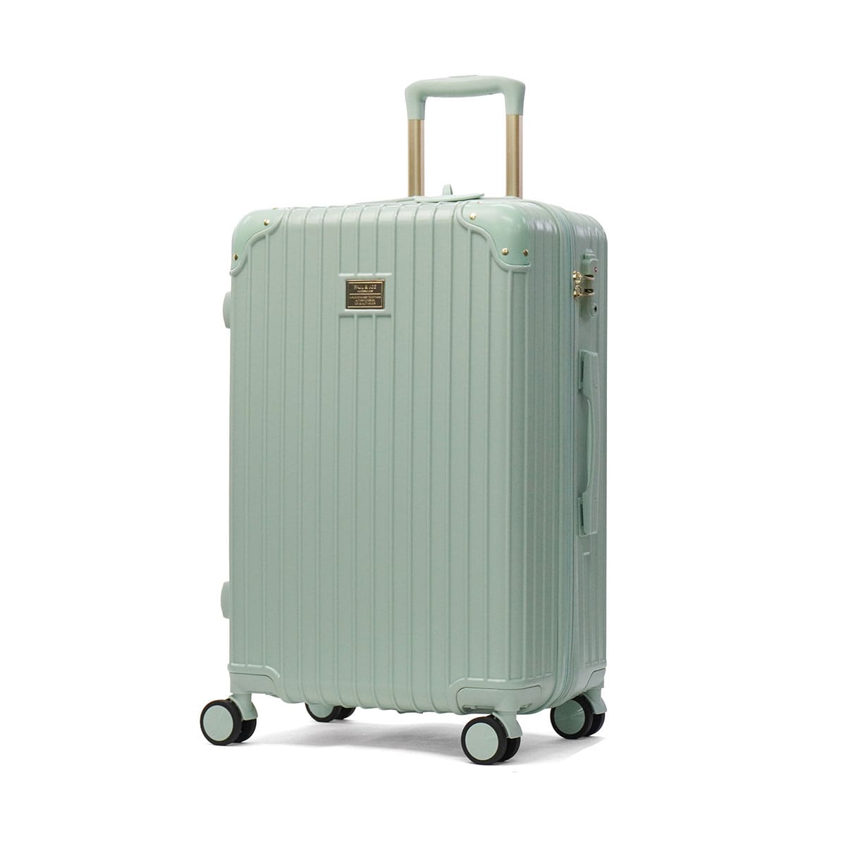 淡いカラーが可愛いスーツケースです。ハンドルやタイヤも本体と同色で統一感のあるデザイン。表面は傷が目立ちにくいシボ加工仕上げで、上品な印象に。こちらは、拡張可能な63?72L容量で荷物が増えても安心。内装にはヌネット&クリザンテームの総柄を採用し、華やかさも◎。着替えの収納に便利な同柄ポーチ付き。猫型ネームタグや折りたたみ式カップホルダーなど、機能性にもこだわった一品です。
