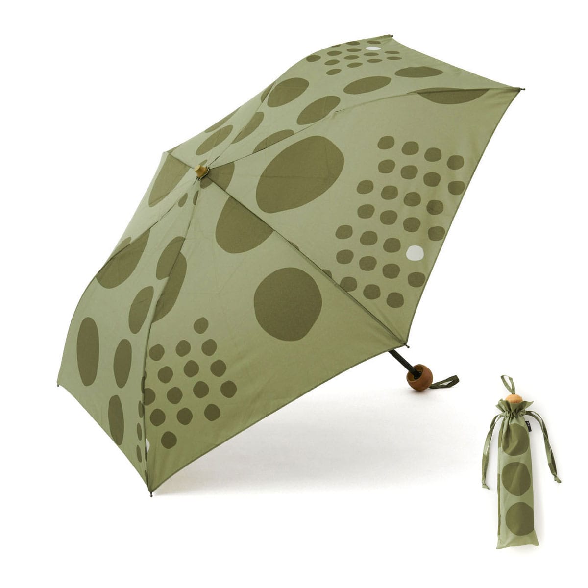 大小さまざまな丸型模様が目を引く、ミドルサイズの折りたたみ傘。たたむのが苦手な方も、長傘のように閉じて、中棒を縮めるだけで簡単に収納できます。付属の収納袋は、収納口が広い巾着タイプなので簡単にしまえて便利。丸くて可愛らしい木製の持ち手は、ナチュラルさをプラス。個性と落ち着きを感じさせるデザインに仕上がっています。