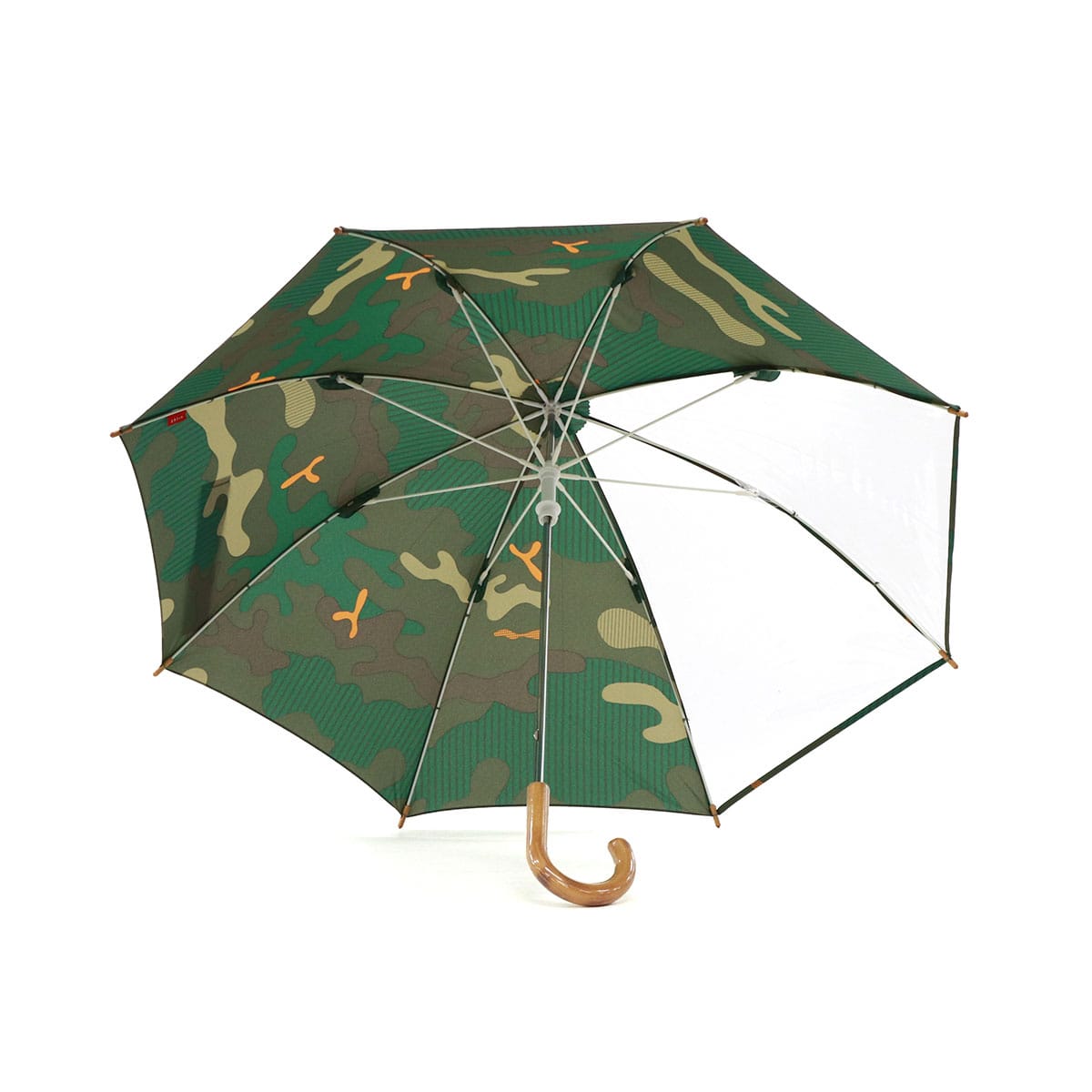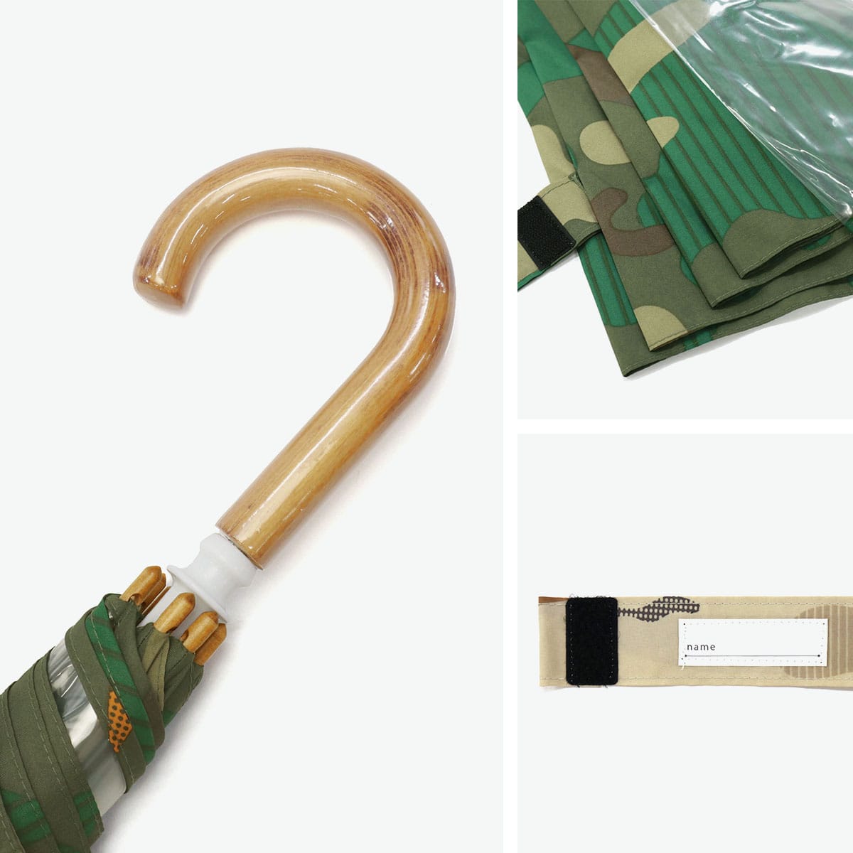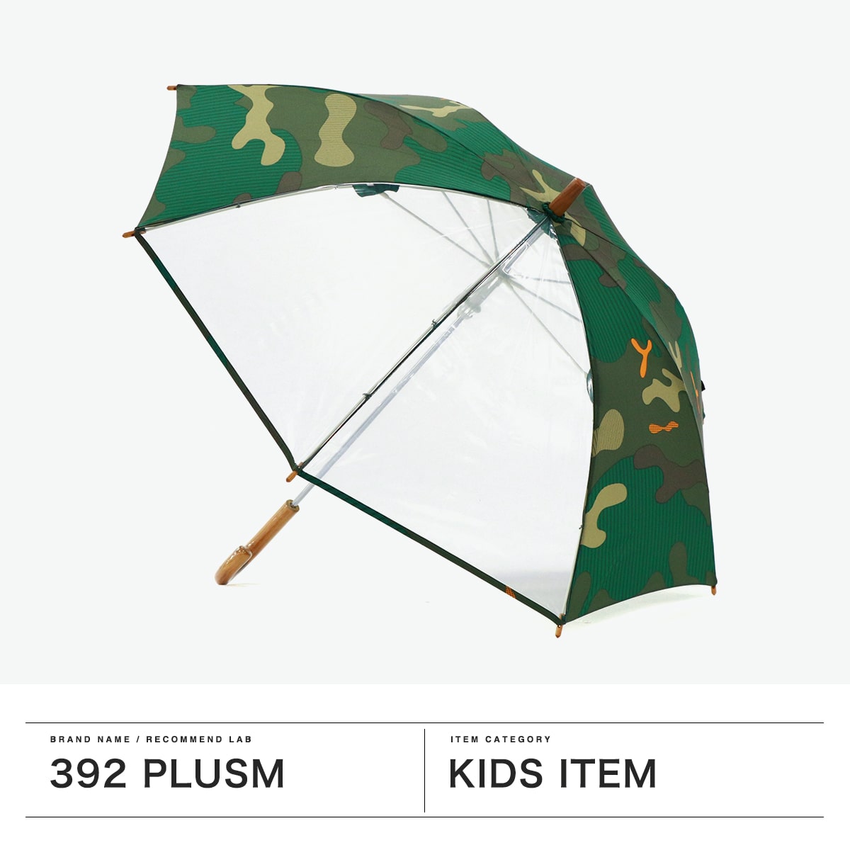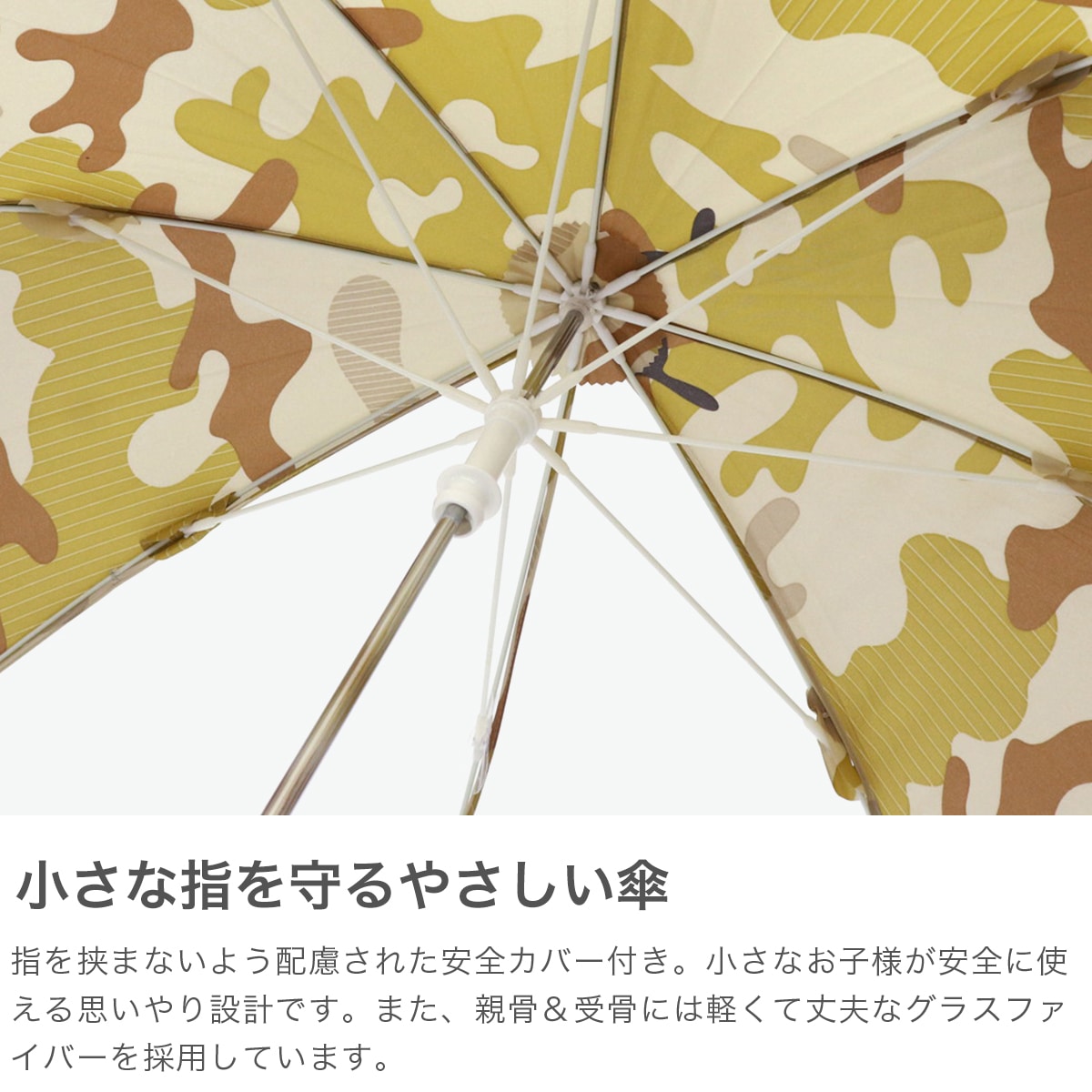 ナチュラルさも感じる品のある迷彩柄がポイント!392plusmのキッズ用長傘は、子どもの使いやすさを追求した安心安全設計。軽くて丈夫なグラスファイバー製&指挟み防止付きで安心。視界確保のクリア窓やネームタグ付きで通学にも最適な1本となっています。