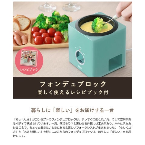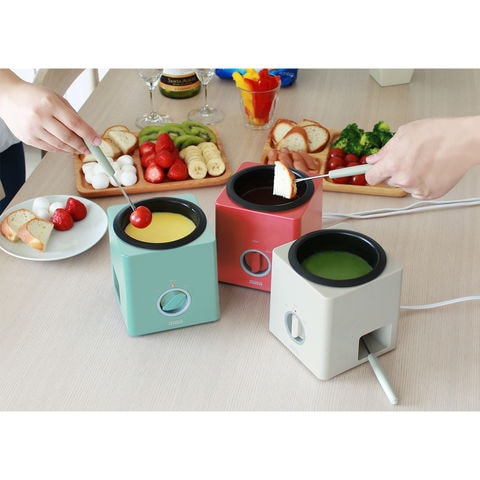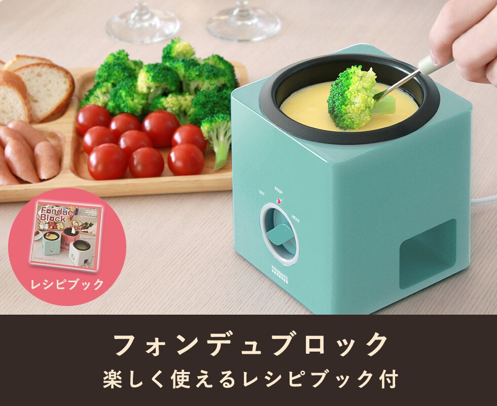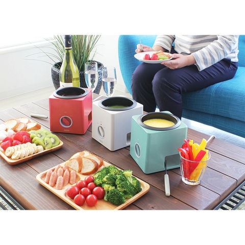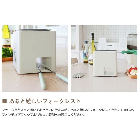 ※製品の仕様・デザイン、パッケージは予告なく変更する場合がございますので、ご了承ください。※本製品を安全に正しくお使いいただくために、お使いになる前に必ず付属の取扱説明書をよくお読みになり、ご使用ください。※本製品でチーズフォンデュをお楽しみいただく際は、別鍋で溶かしたチーズを用意し、保温機能としてご使用ください。※極力実物に近い色味を再現しておりますが、モニター等の条件により画面上と実物では色味が異なって見える場合がございます。