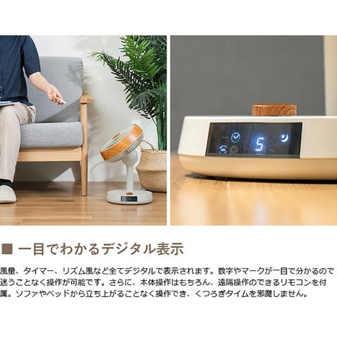 風量、タイマー、リズム風など全てデジタルで表示されます。数字やマークが一目で分かるので迷うことなく操作が可能です。さらに、本体操作はもちろん、遠隔操作のできるリモコンを付属。ソファやベッドから立ち上がることなく操作でき、くつろぎタイムを邪魔しません。