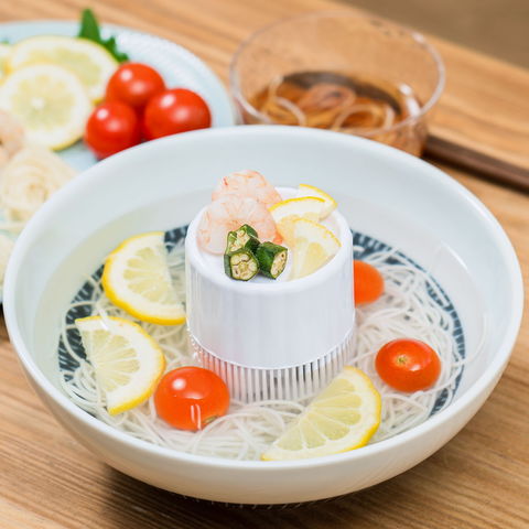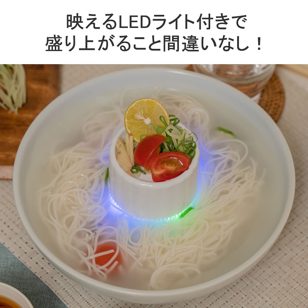 ご用意いただくのは、直径約16cm~23cmまで、高さ約7以上、底面の直径約7cm以上の器と乾電池のみ。器の中心に本体をセットするだけで、いつでもどこでも手軽に流しそうめんを楽しむことができます。自動で色が変わるLEDライト付きなので、小さなお子様も喜ぶアイテムとなっています。