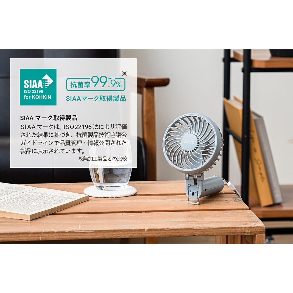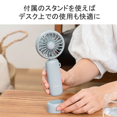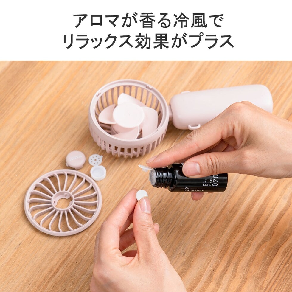 屋内でも周りの目が気にならないほど静かなのに、風量はパワフルなハンディファン。卓上、首かけ、手持ちができる3WAY仕様で、場面に応じた使い方ができます。さらに、アロマオイルの使用も可能。お好きなアロマを付属トレーに垂らせば、いつでもどこでもリラックスできる空間を実現します。