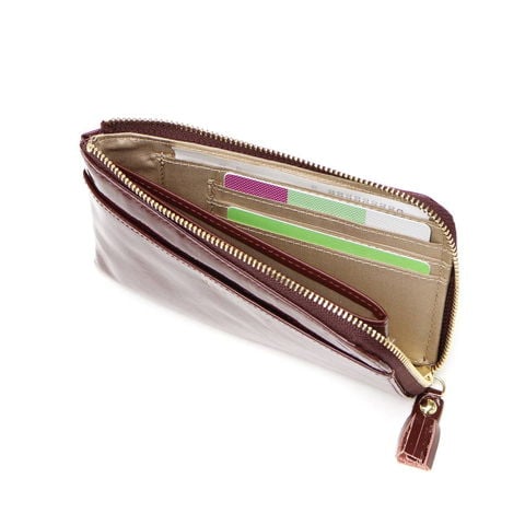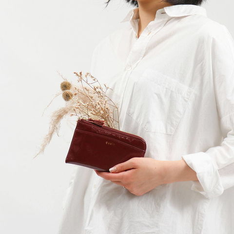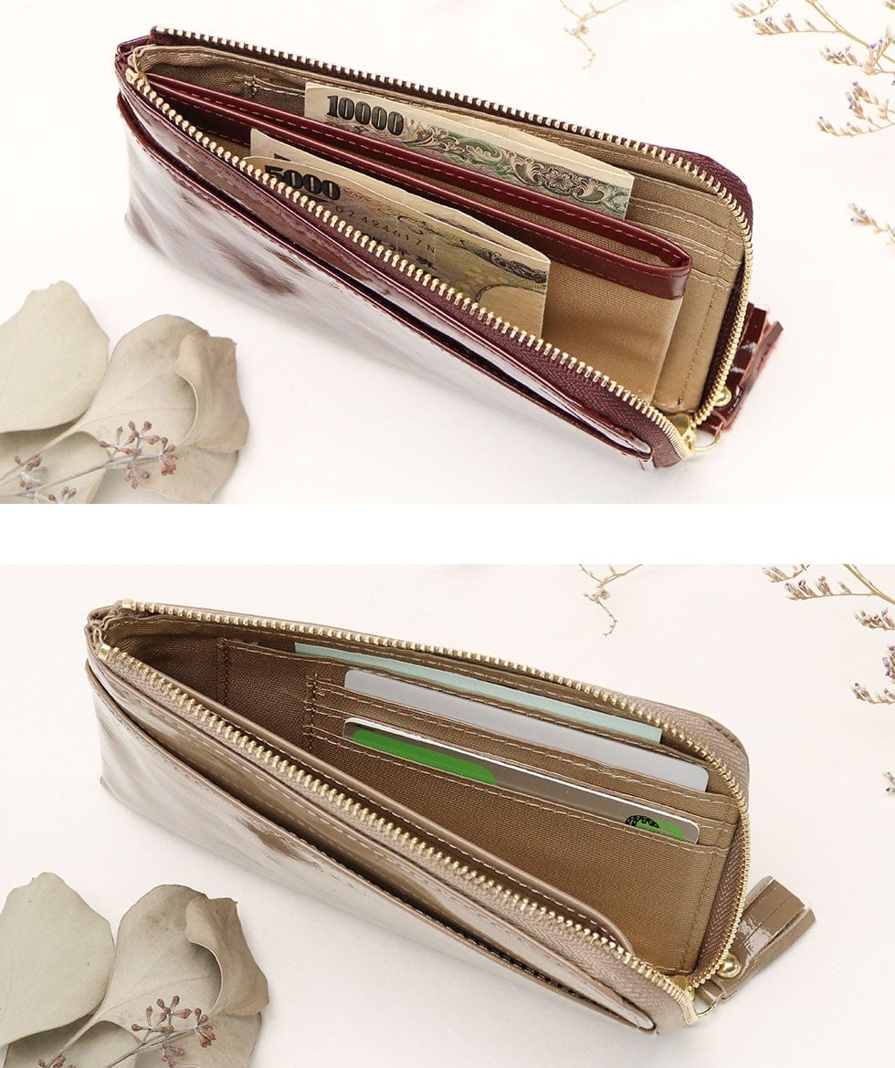 くしゅっとしたシワ感のあるエナメルを使用し、女性らしい上品さを纏ったL字ファスナー財布。すっきりとしたスリムなシルエットながら、必要な分はしっかりと収まるサイズ感がポイント!とろみのあるヌーディーなカラーとニュアンスの効いた深みのあるカラーを揃え、雰囲気のある手元を演出してくれます。