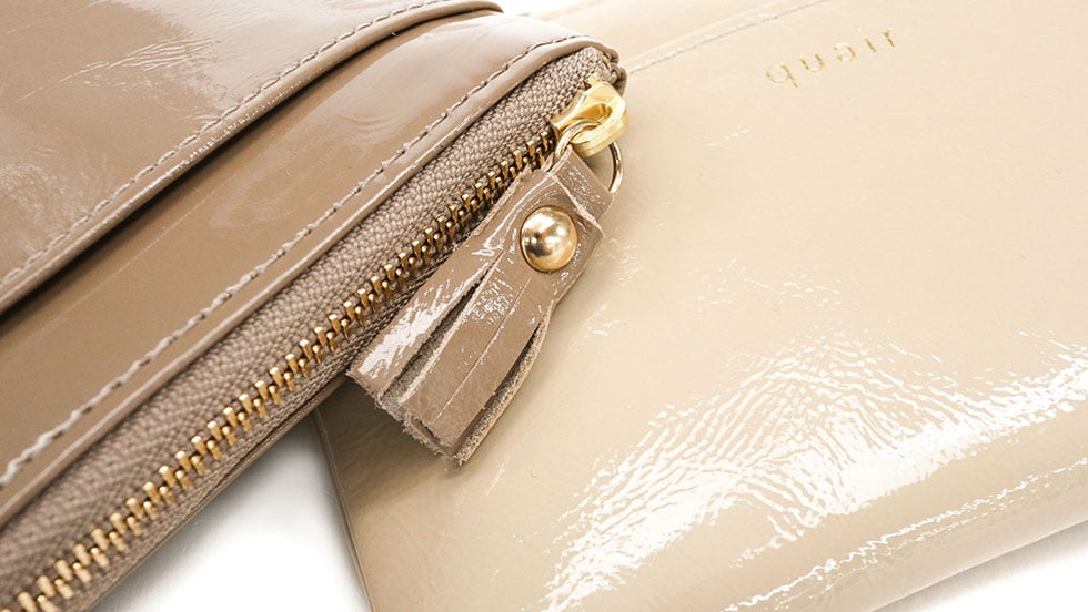 メイン素材には、艶やかなエナメル仕上げの牛革を贅沢に使用。柔らかく手触りの良いレザーにくしゅっとしたシワ感をプラスし、華やかになりすぎず、優しい品のある仕上がりになっています。