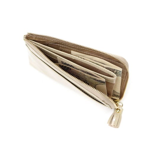 L字ファスナー開閉の収納部は、中央の小銭入れが仕切りとなり、両サイドに折り畳んだお札を分けてしまえるつくり。コンパクトながらフリーポケットを2ヶ所、カードポケットを計6ヶ所設け、見た目以上にたっぷりとしまえるデザインです。