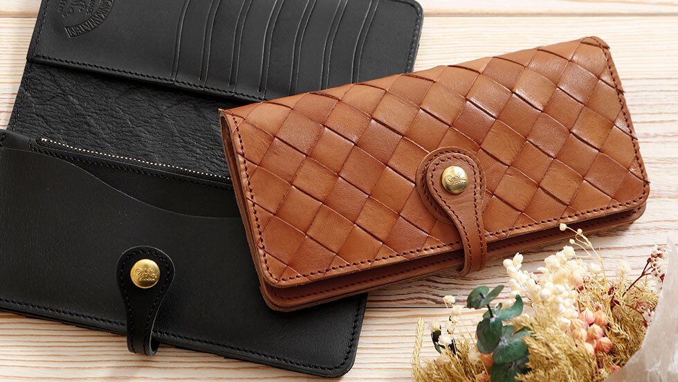 robitaのロングランシリーズ「anyam nya robita」の二つ折り長財布。従来のrobitaの財布よりも幅の広い革を編み込んで作られたメッシュレザーが特徴で、手の込んだ過程から生まれるアンティーク感が魅力的です。