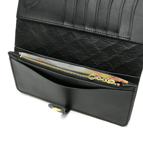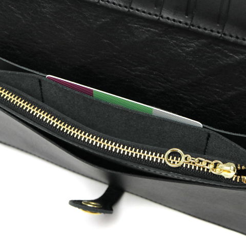 開閉部はスナップボタンで大きく開く手帳のようなデザインが特徴です。大きめのポケットを複数備えているので、お札やレシート、チケットなどのアイテムを種別に管理することができます。さらにカードポケットも7箇所に設けているので、お財布の中をすっきりと整理しておけます。
