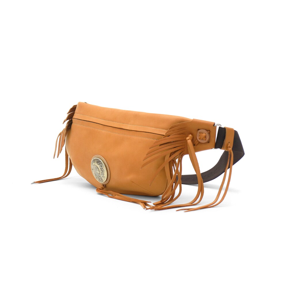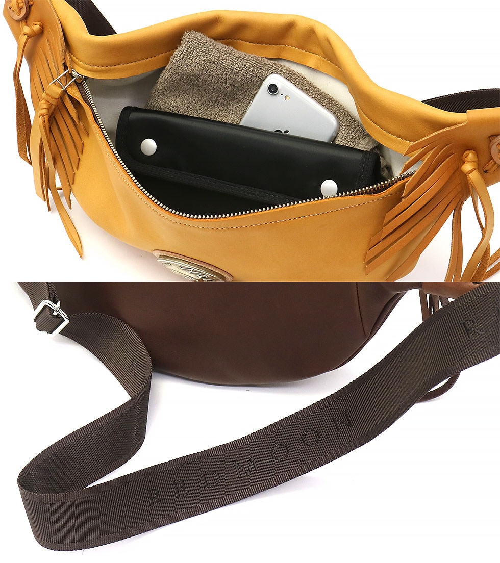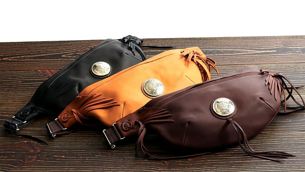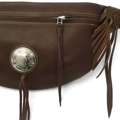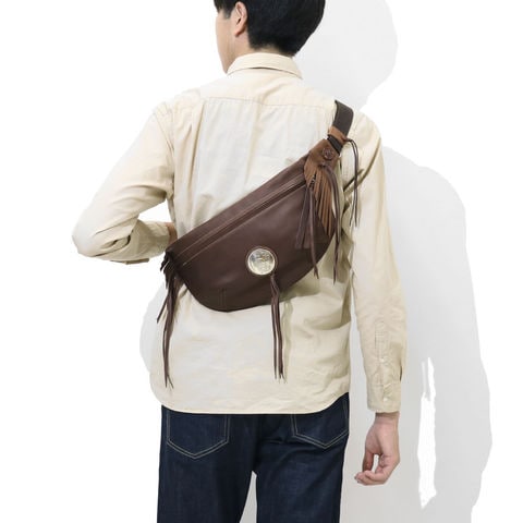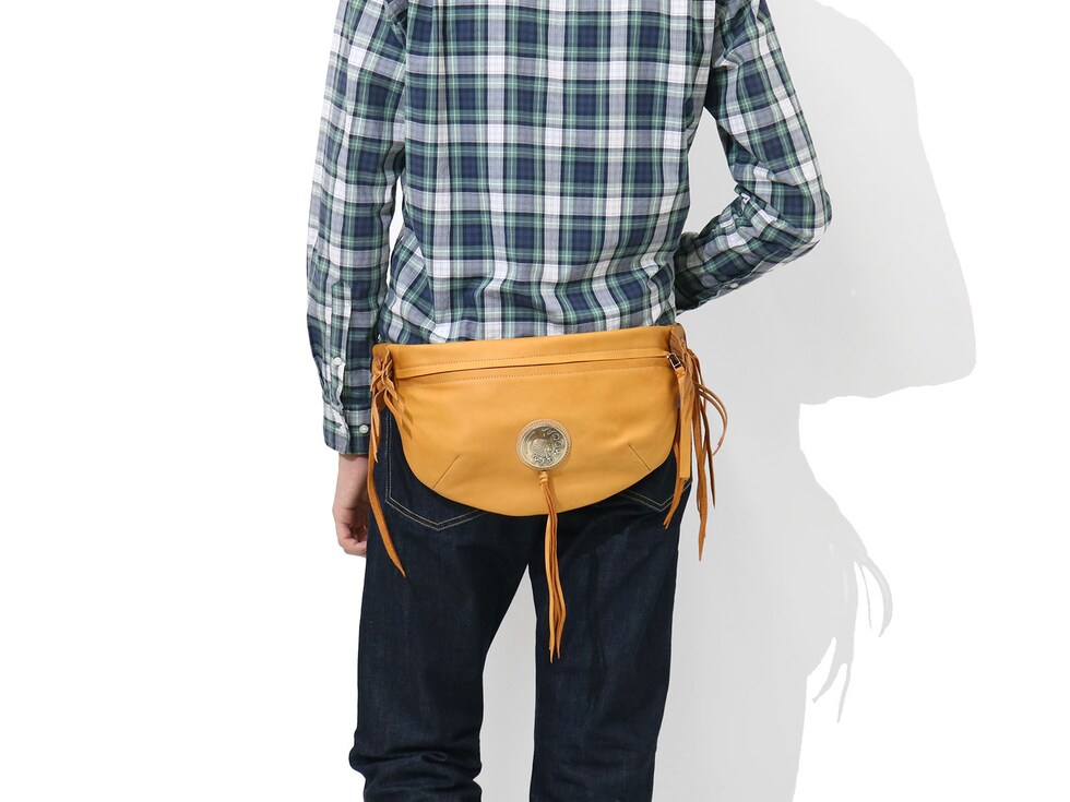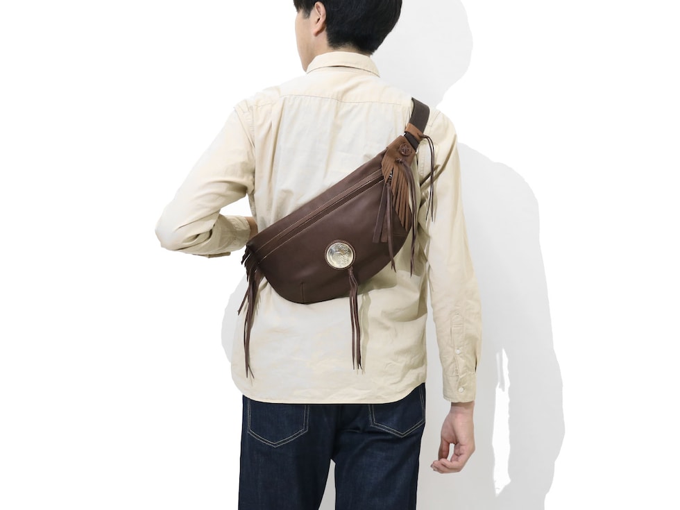 直径51mmもあるRMネイティブアメリカンオリジナルコンチョがポイントになったボディバッグ。両ウィングにつけられたハンドメイドフリンジと合わさることで、すれ違う人の目を引く独特な雰囲気を醸し出しています。
