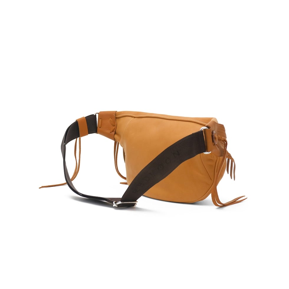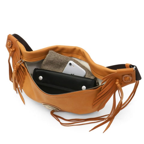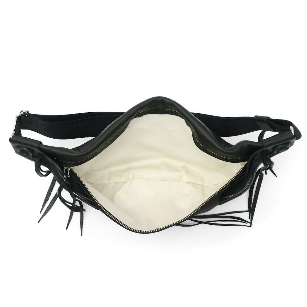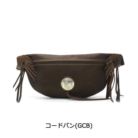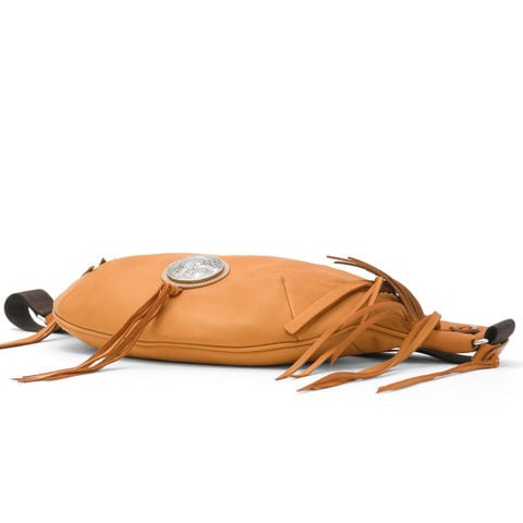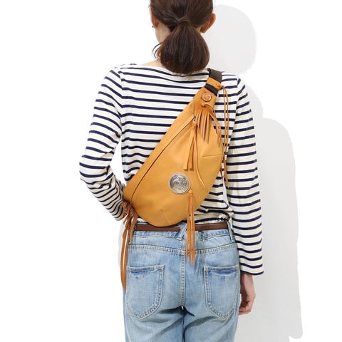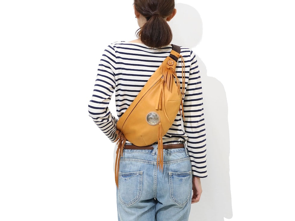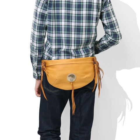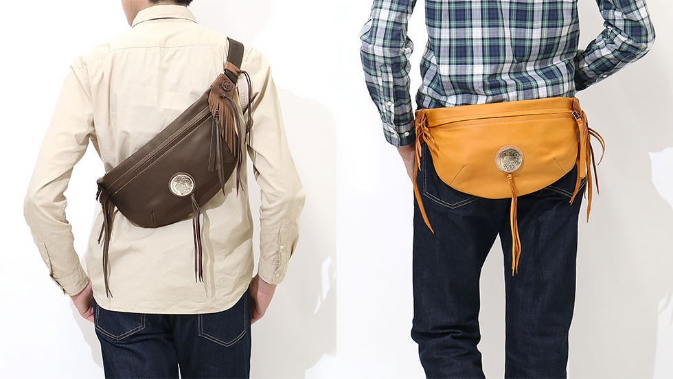 直径51mmもあるRMネイティブアメリカンオリジナルコンチョがポイントになったボディバッグ。両ウィングにつけられたハンドメイドフリンジと合わさることで、すれ違う人の目を引く独特な雰囲気を醸し出しています。