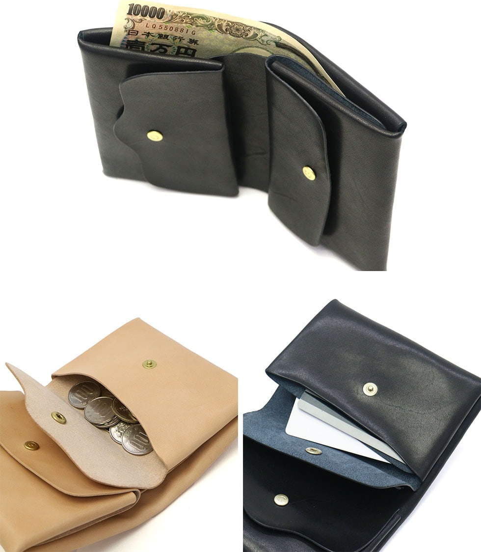 札入れ、カードポケット、小銭入れを装備したシンプルな内装は使いやすさを重視。カードポケット、小銭入れはスナップ留めになっているので、スムーズに出し入れすることができます。