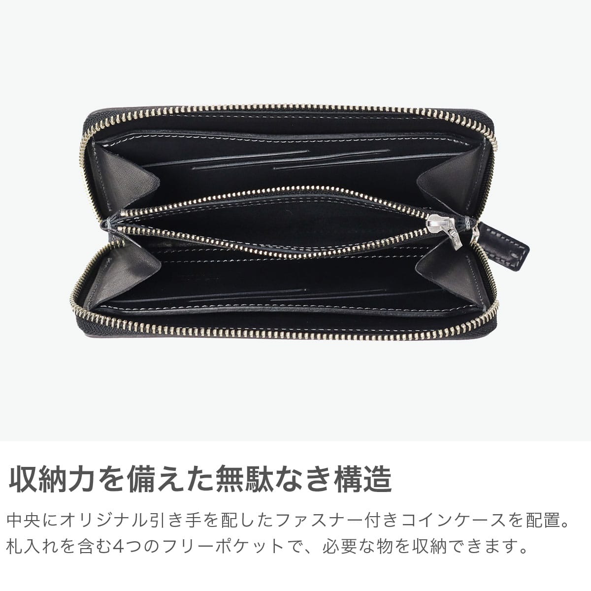 英国トーマスウェア&サンズ社のブライドルレザーを使用したラウンドファスナーロングウォレット。新仕様のカード収納はスリットタイプで、1箇所に2枚ずつ入れられスマートな出し入れが可能です。日常使いに十分な収納力を確保しつつ、無駄を省いたスマートなフォルムはビジネスにもカジュアルにも自然に馴染みます。上質な素材と洗練された機能美が融合した、大人のための上品な逸品です。