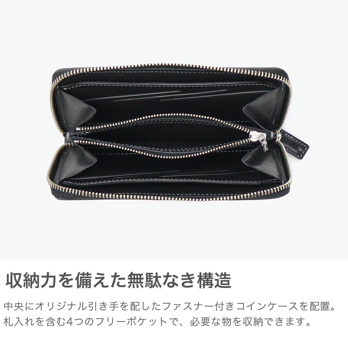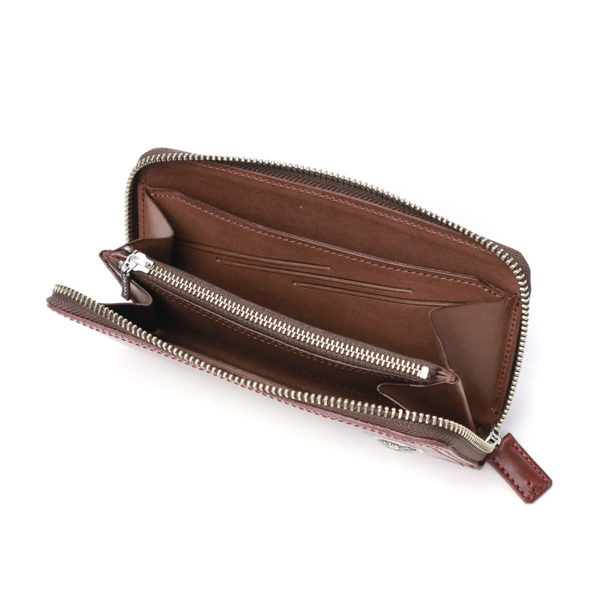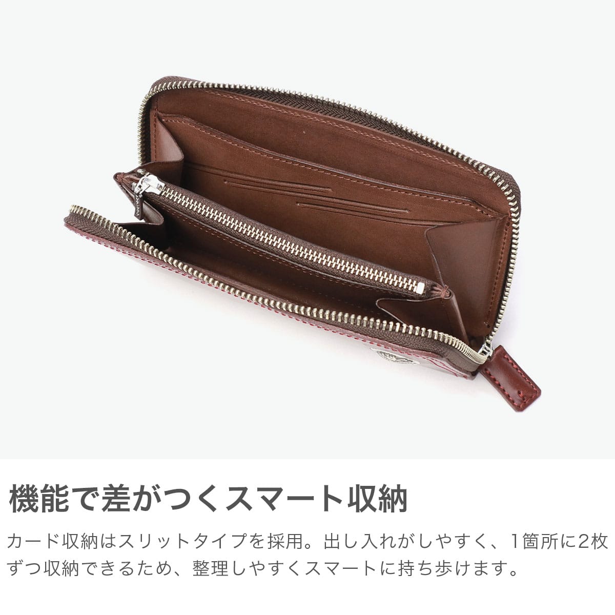 英国トーマスウェア&サンズ社のブライドルレザーを使用したラウンドファスナーロングウォレット。新仕様のカード収納はスリットタイプで、1箇所に2枚ずつ入れられスマートな出し入れが可能です。ブランドの象徴とも言えるオリジナルコンチョがポイントとなり、シンプルながらもシンプルながらも存在感のあるデザインに仕上がっています。上質な素材と洗練された機能美が融合した、大人のための上品な逸品です。