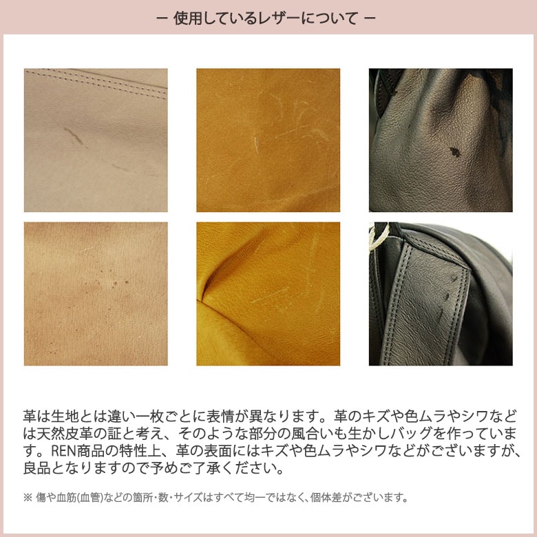・天然皮革や天然素材を使用した製品は、素材本来の風合いとしてキズや色ムラ、シワ、色の濃淡、素材の割れ、けば立ち、形の歪みなど、一点一点違いが見られる場合がございます。商品の特性としてご理解の上、お楽しみください。