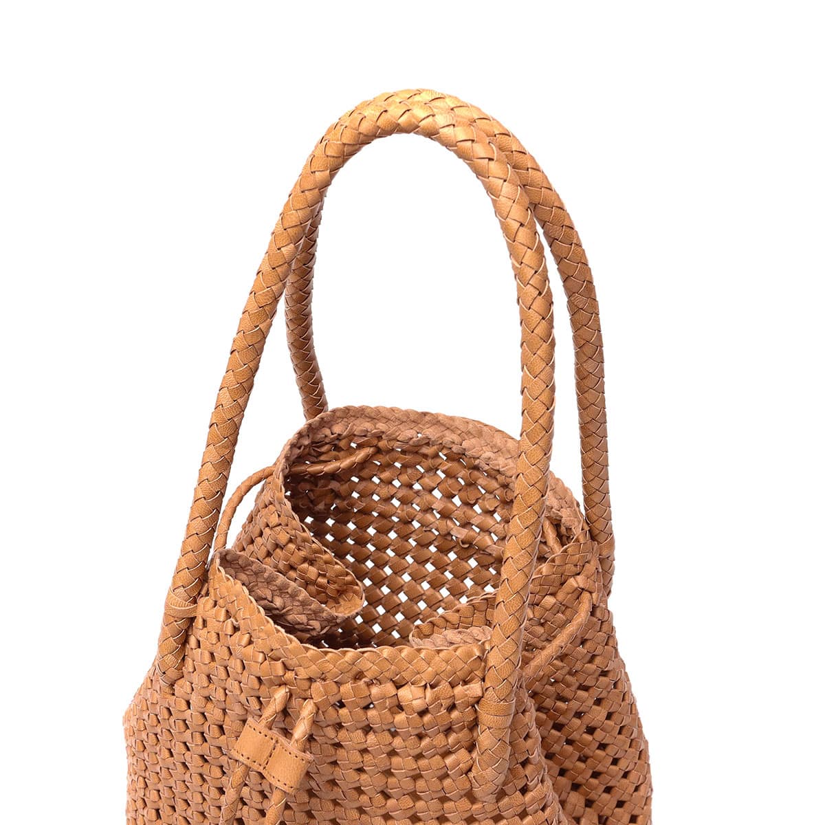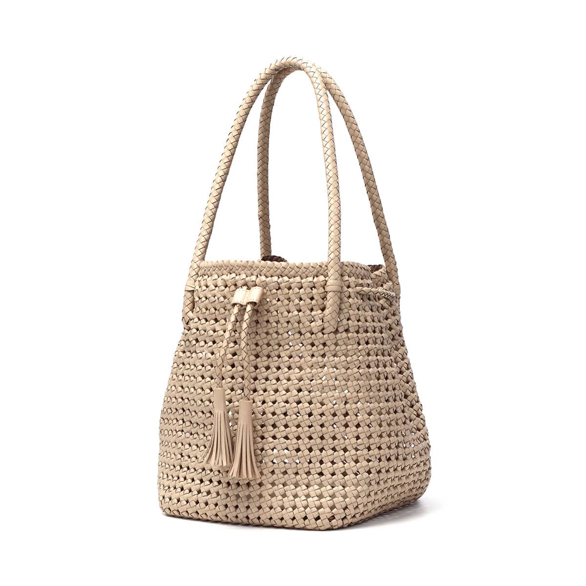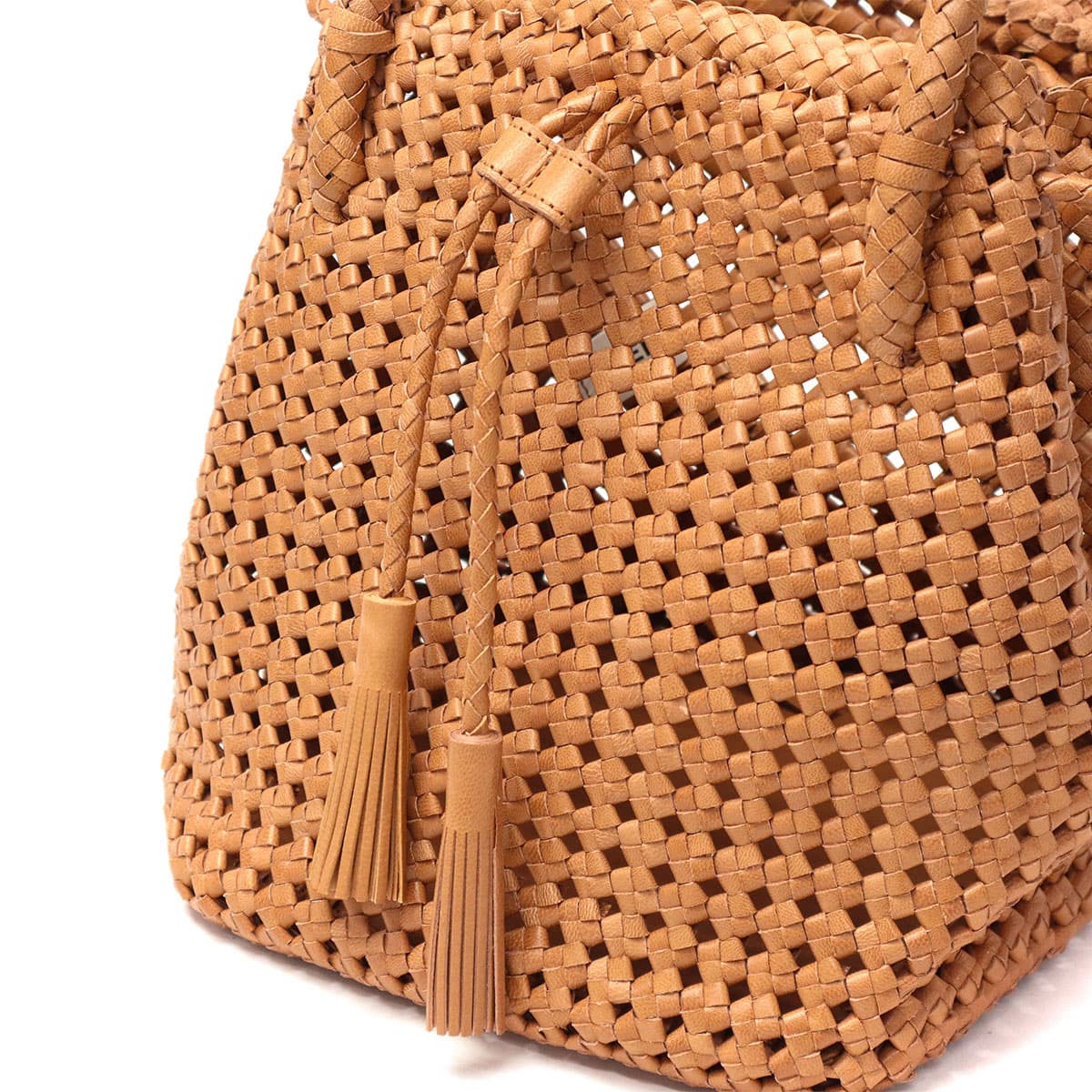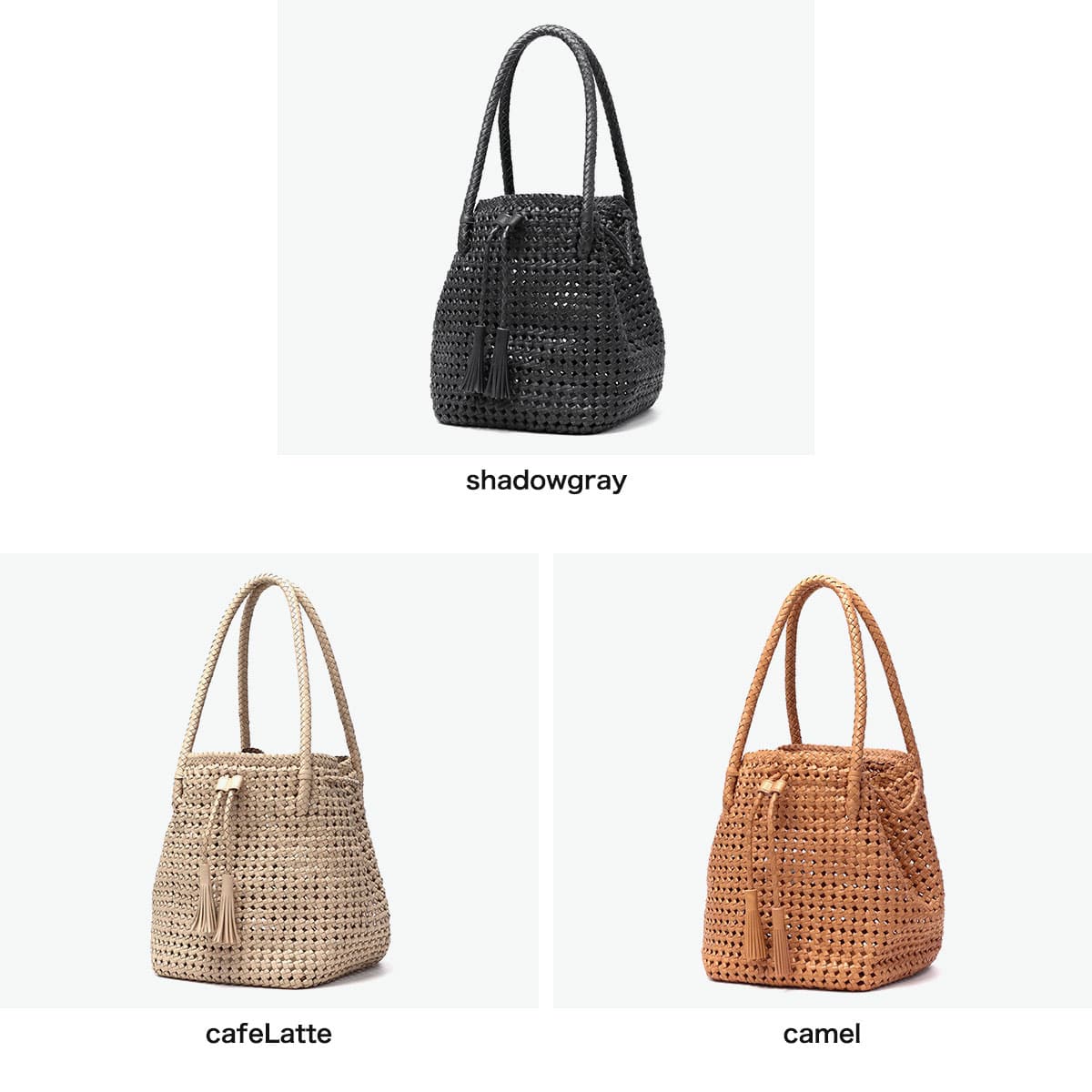 手編みの革の軽やかな透け感と、巾着のような立体的なフォルムが魅力的なメッシュトートバッグ。遊び心のあるフリンジタッセルがアクセントになっています。タッセルの絞り方で雰囲気ががらりと変わるため、気分に合わせてアレンジをお楽しみいただけるアイテムです。