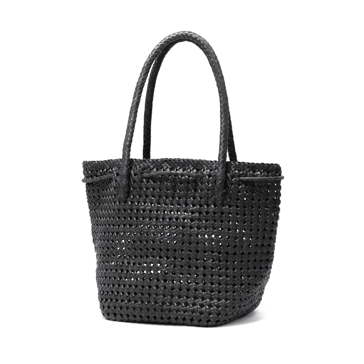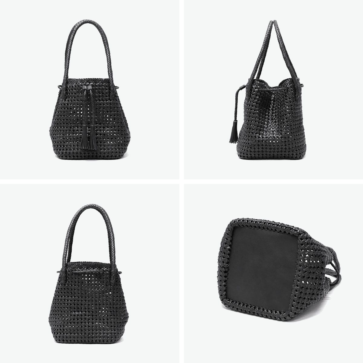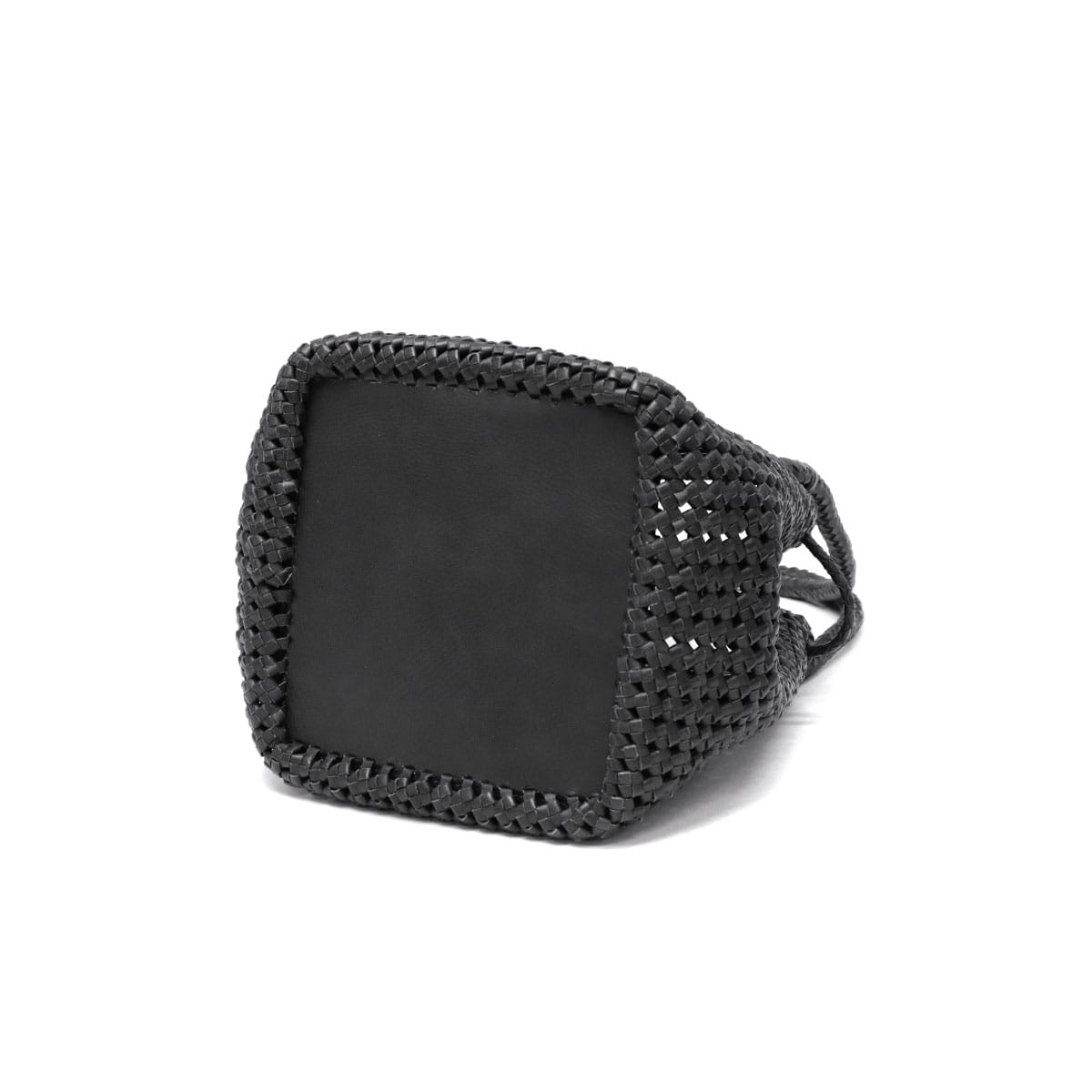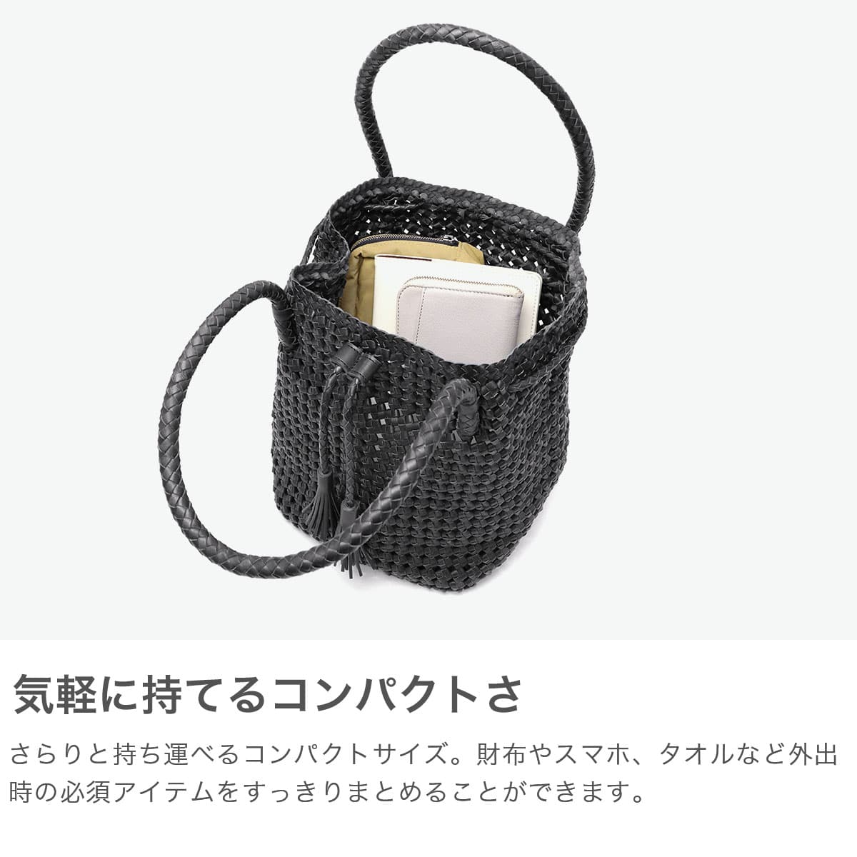手編みの革の軽やかな透け感と、巾着のような立体的なフォルムが魅力的なメッシュトートバッグ。遊び心のあるフリンジタッセルがアクセントになっています。タッセルの絞り方で雰囲気ががらりと変わるため、気分に合わせてアレンジをお楽しみいただけるアイテムです。