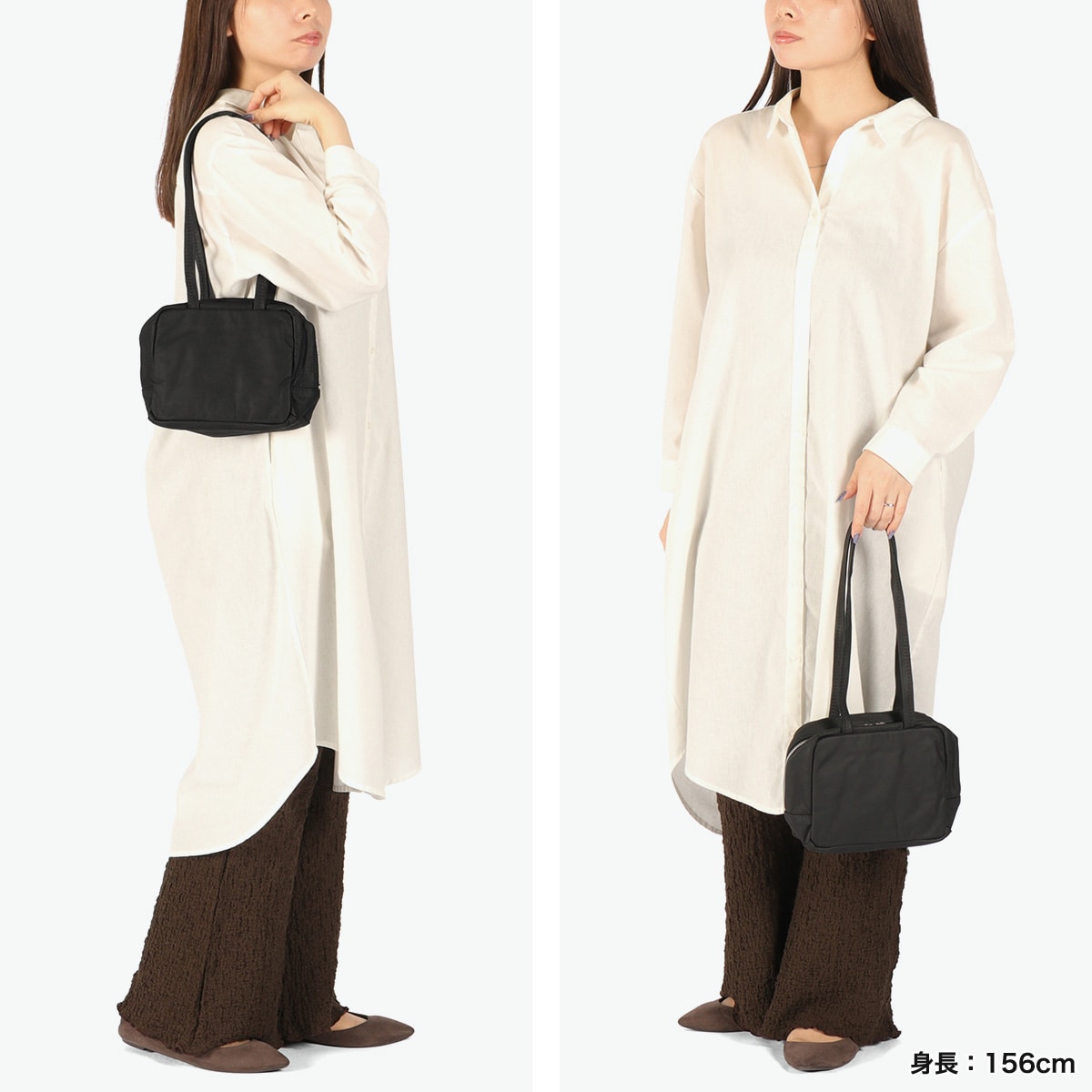 まるで空気を含んだような軽さと、ふんわりとやわらかな手触りが特徴のバッグ。肩周りにゆとりが生まれ、動きを邪魔しない長めのハンドルがポイントです。厚手のニットやコートの上からでも肩掛けしやすく、小さめバッグの難点を解消。荷物を少なく身軽にお出かけしたいときに最適なミニマムバッグです。