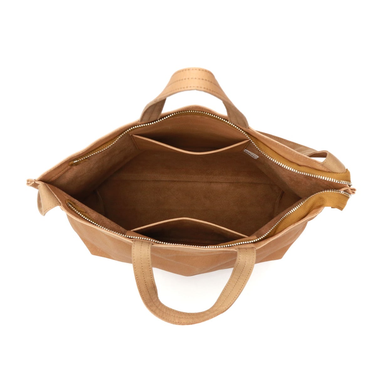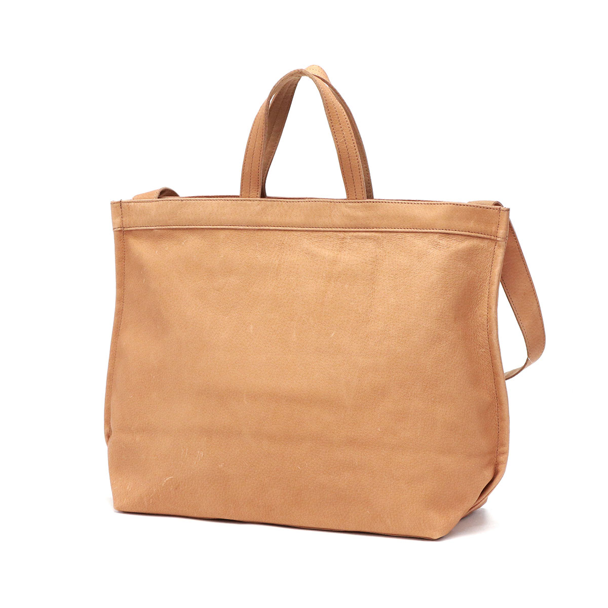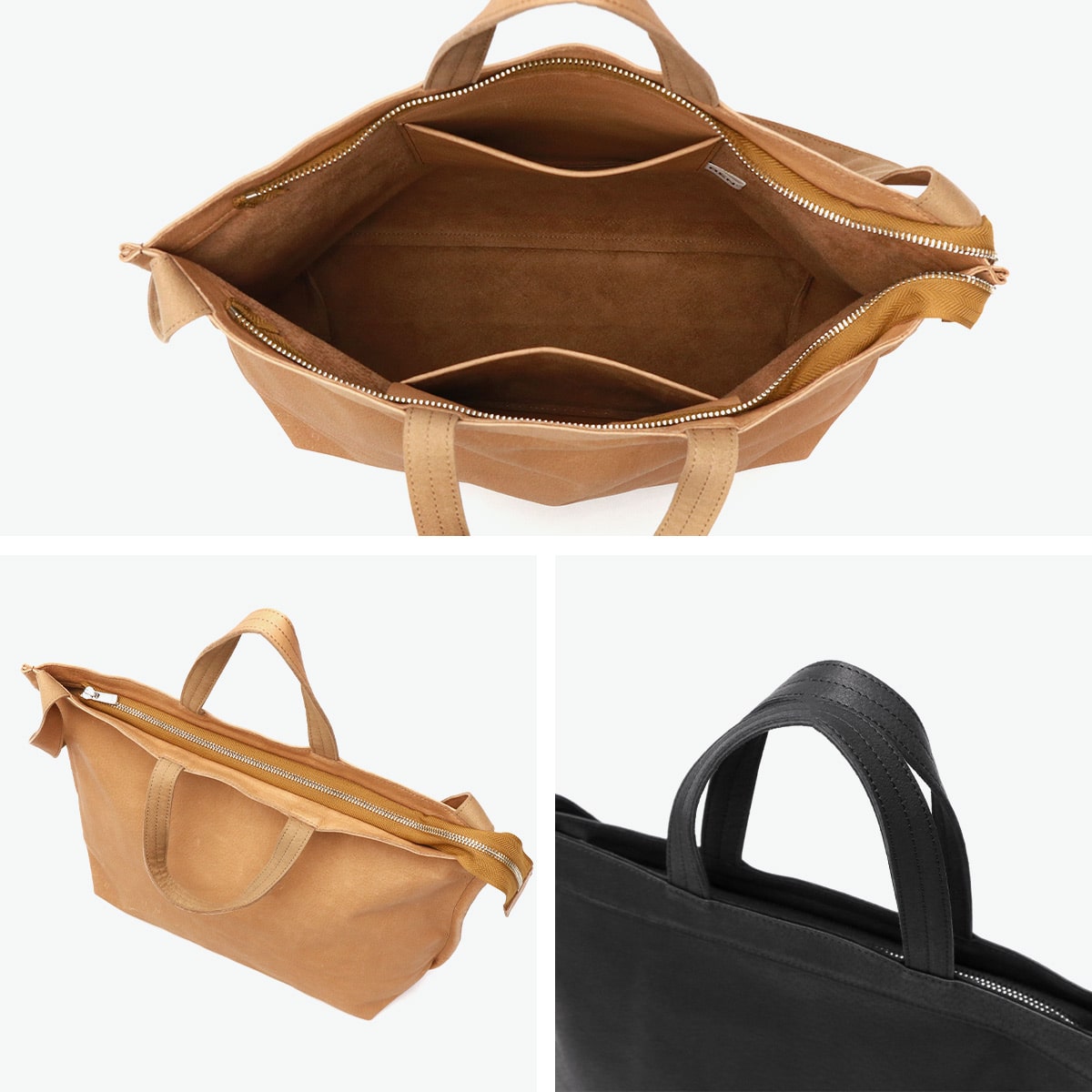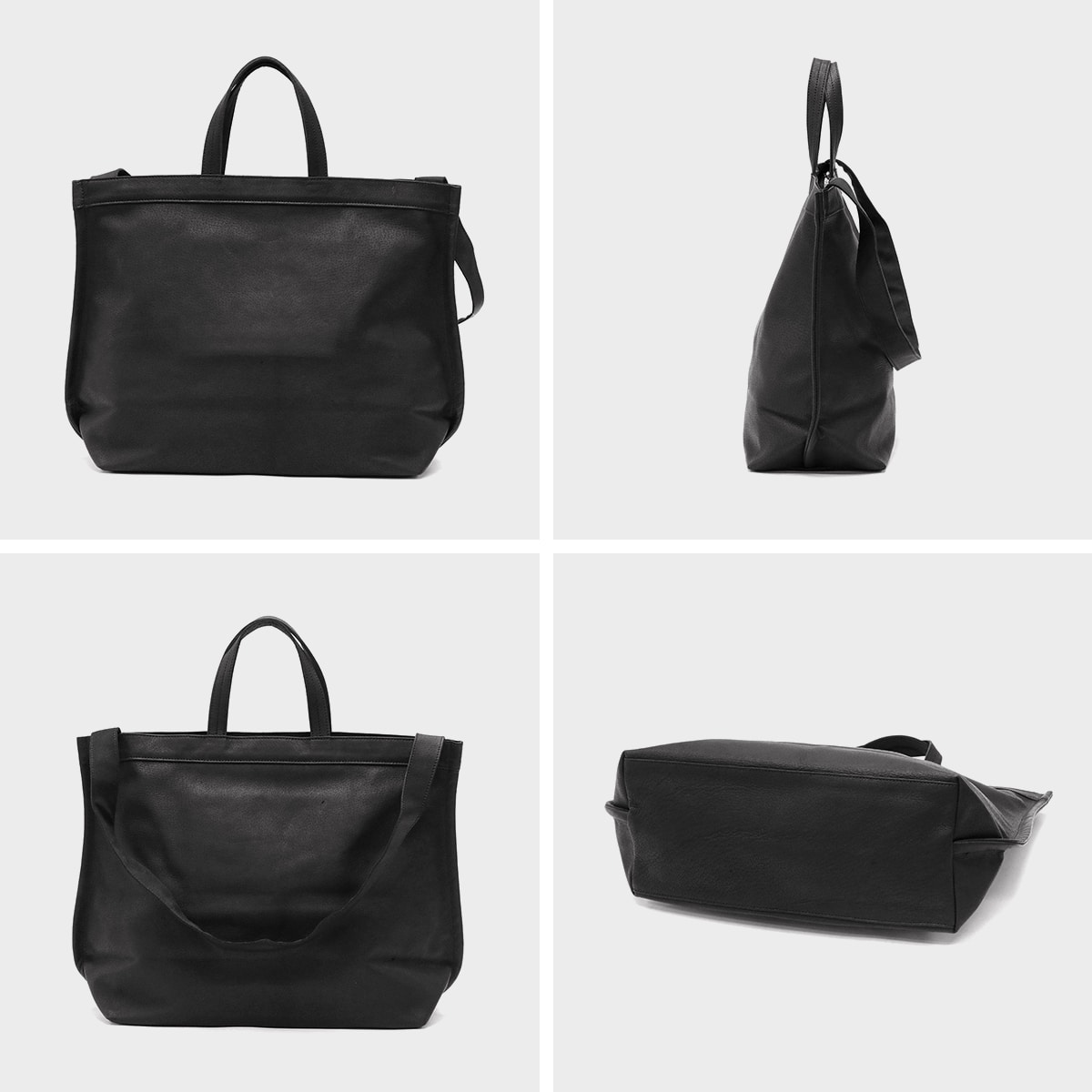 必要な荷物がしっかり収まるサイズ感が魅力のトートバッグです。くったりとした柔らかさのあるピッグレザーは丈夫でしなやかな素材感。ファスナー付きでバッグに深さもあるので、電車や自転車に乗るときも安心です。美しい見た目と実用性を両立し、手持ちでも肩掛けでもスマートなバランスが魅力です。