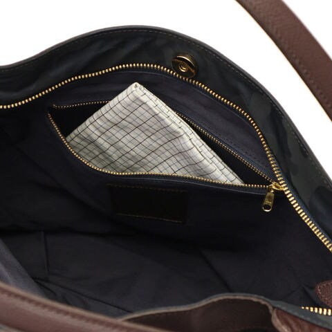 メインルームにはマグホックとジップファスナー開閉を採用。A4サイズがゆったりしまえる大きさで、長財布やペットボトルの他に雑誌も収納できるサイズ感です。内側には、ジップポケットや小物類の収納に最適な小分けポケットが備わっているので、バッグの中身をきれいに整理することができます。