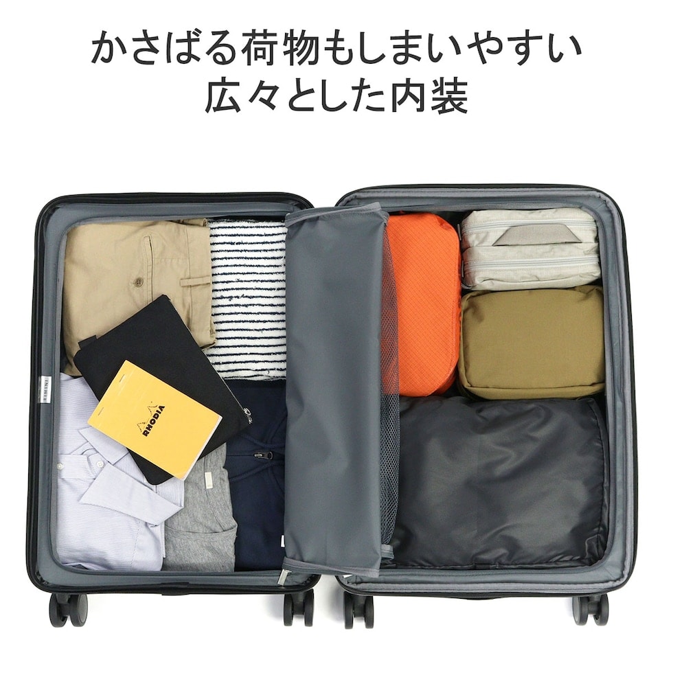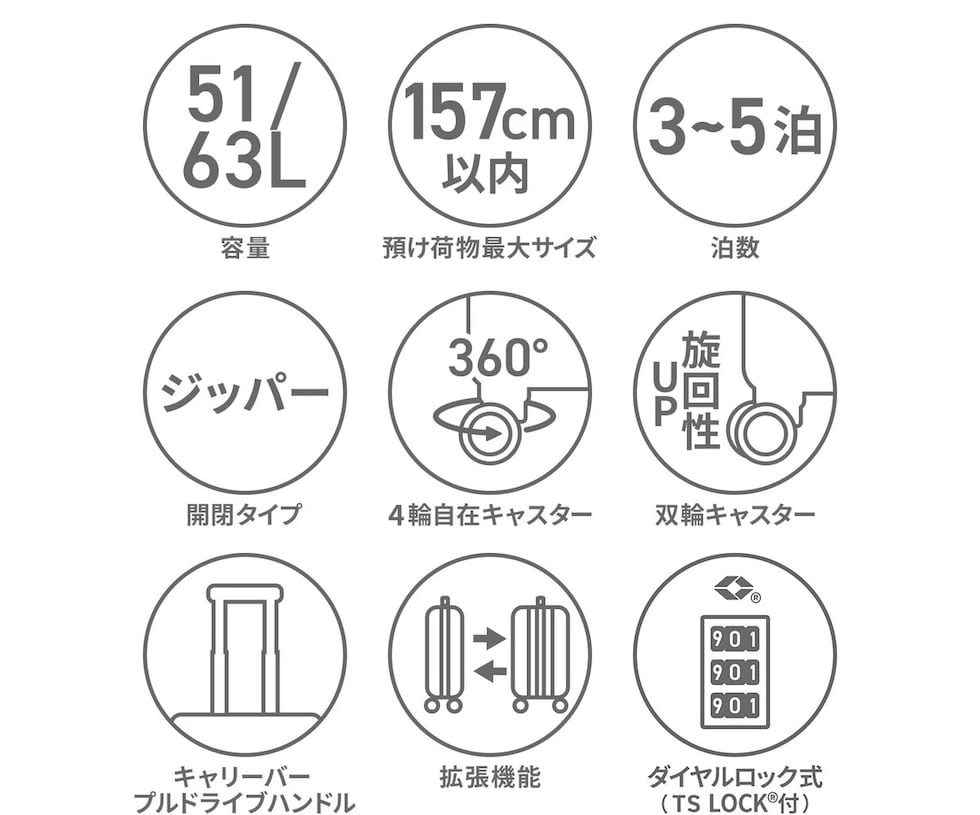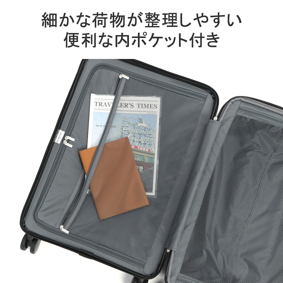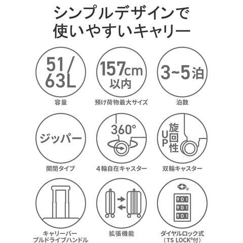 クリーンでシンプル、そして高品質なトラベルブランド『RIMINI/リミニ』。こちらは、3?5泊程度の旅行に丁度いいサイズのスーツケースです。容量はエキスパンダブル機能搭載で、51L~63Lに拡張可能。荷物をざくざく収納できるシンプルな内装設計や、滑らかに走行できる双輪キャスター、海外旅行にも安心のTSロック付である等、旅行を快適にサポートする機能性に富んだ仕上がりとなっています。