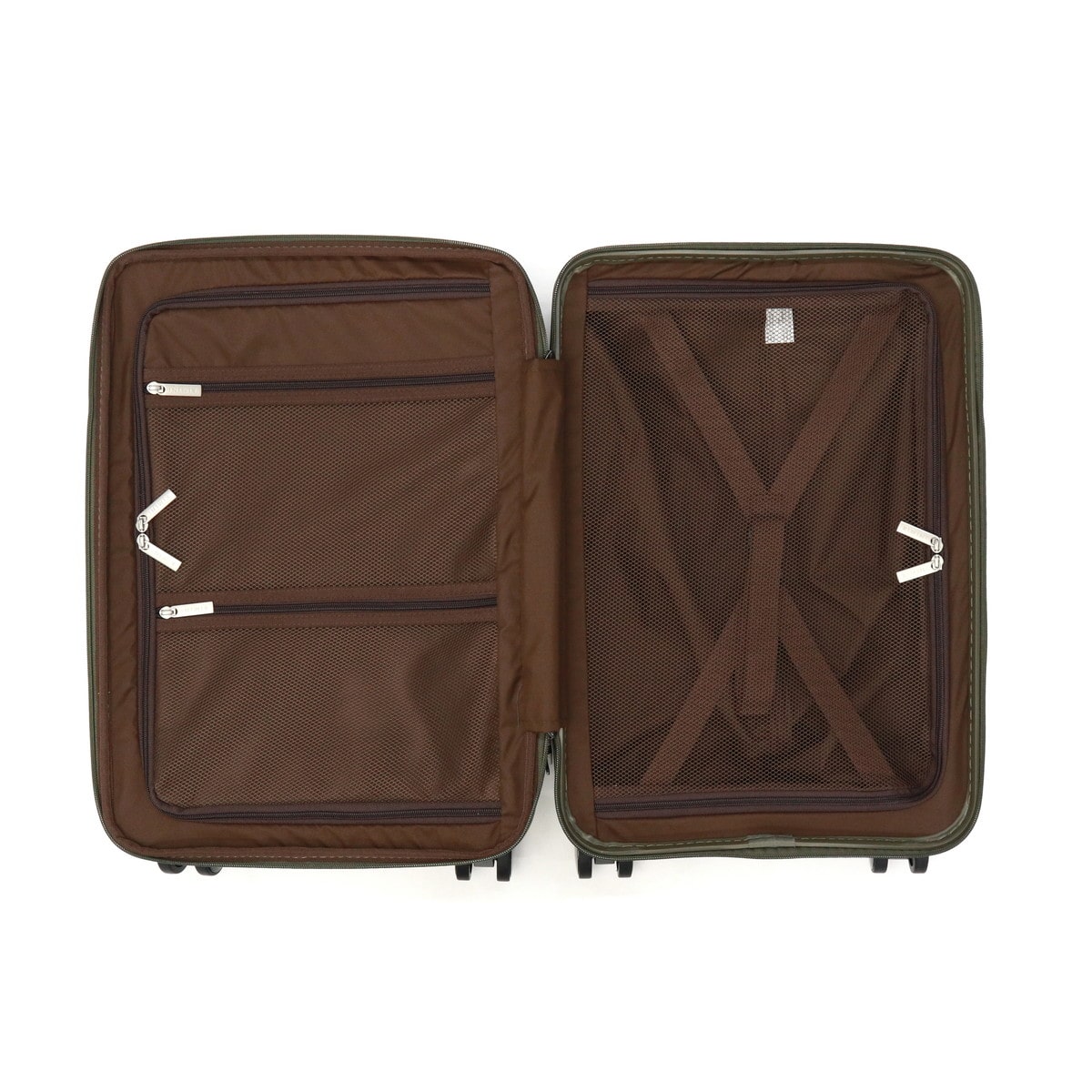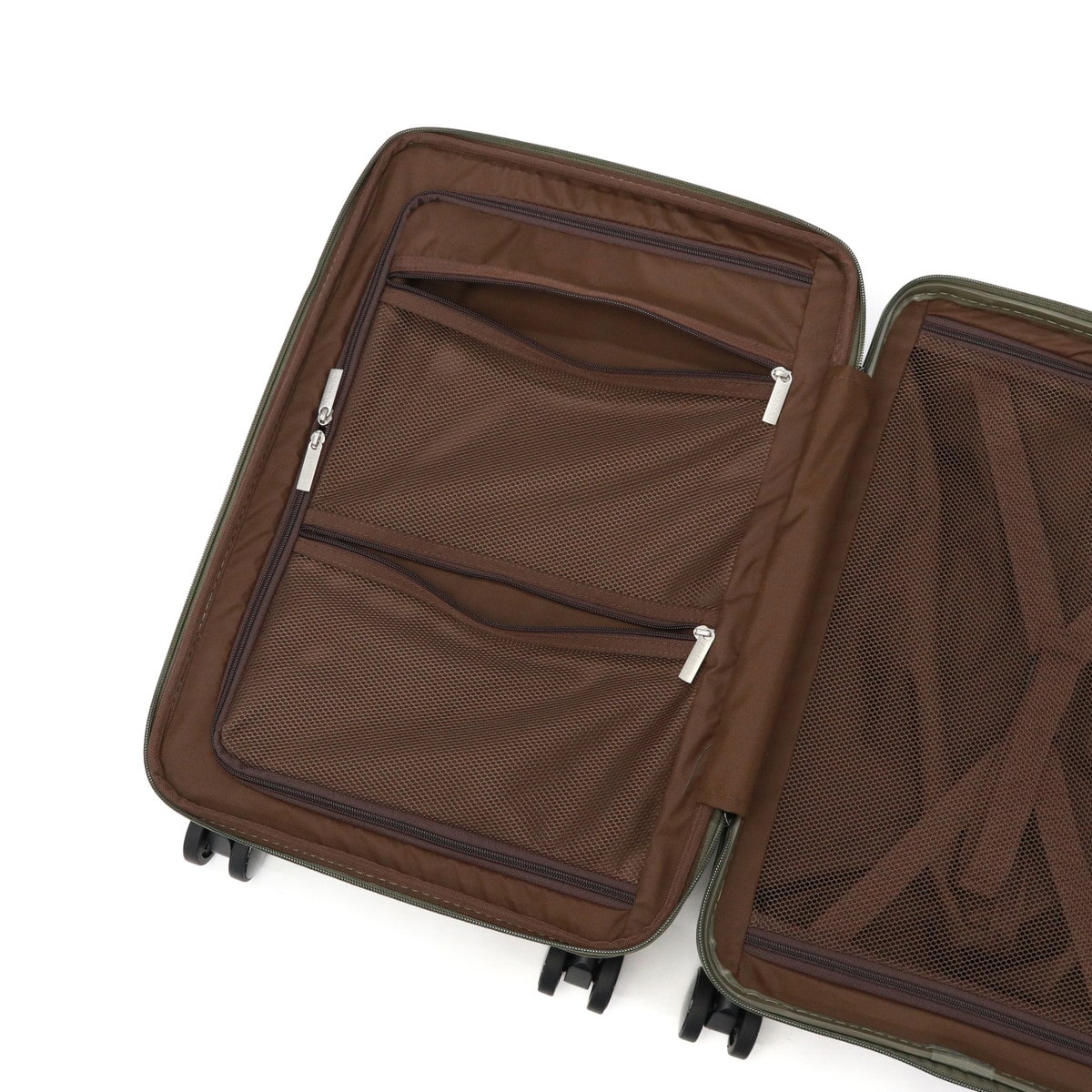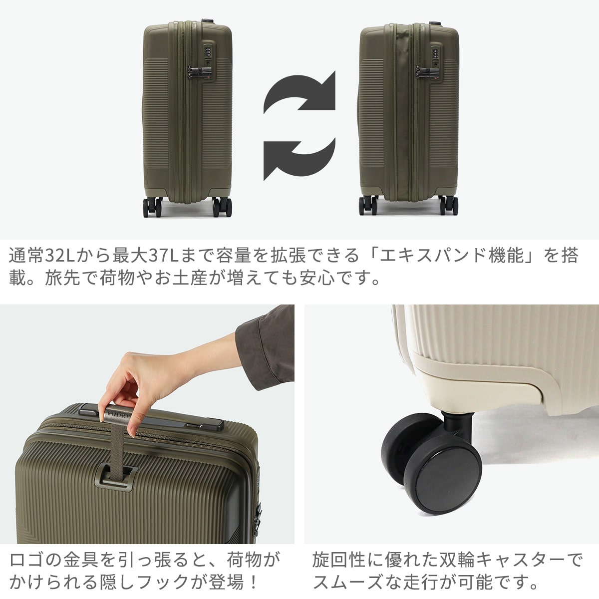 落ち着いた印象のマットシェルに、多方向からの流れるラインのリブが映える『RIMINI』のスーツケース。機内持ち込み可能タイプのコンパクトサイズですが、容量はエキスパンダブル機能搭載で、32L~37Lに拡張可能。正面の上部中央に設けられた隠しフックや、荷こぼれを防ぐ両面の中仕切りタイプの内装など、旅行や出張を快適にサポートする工夫が随所にちりばめられています。