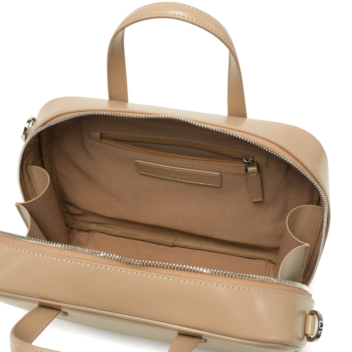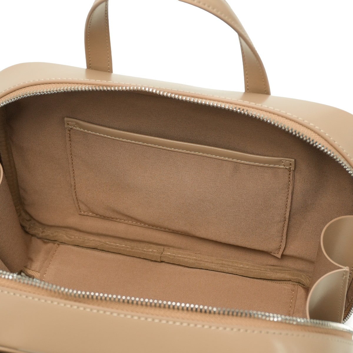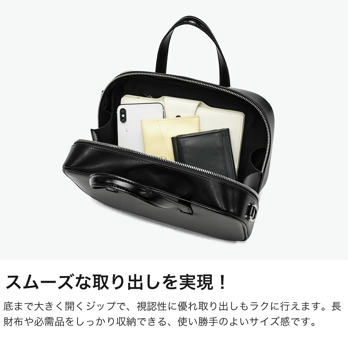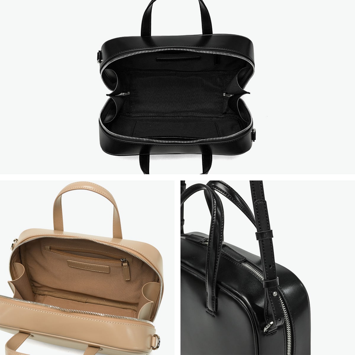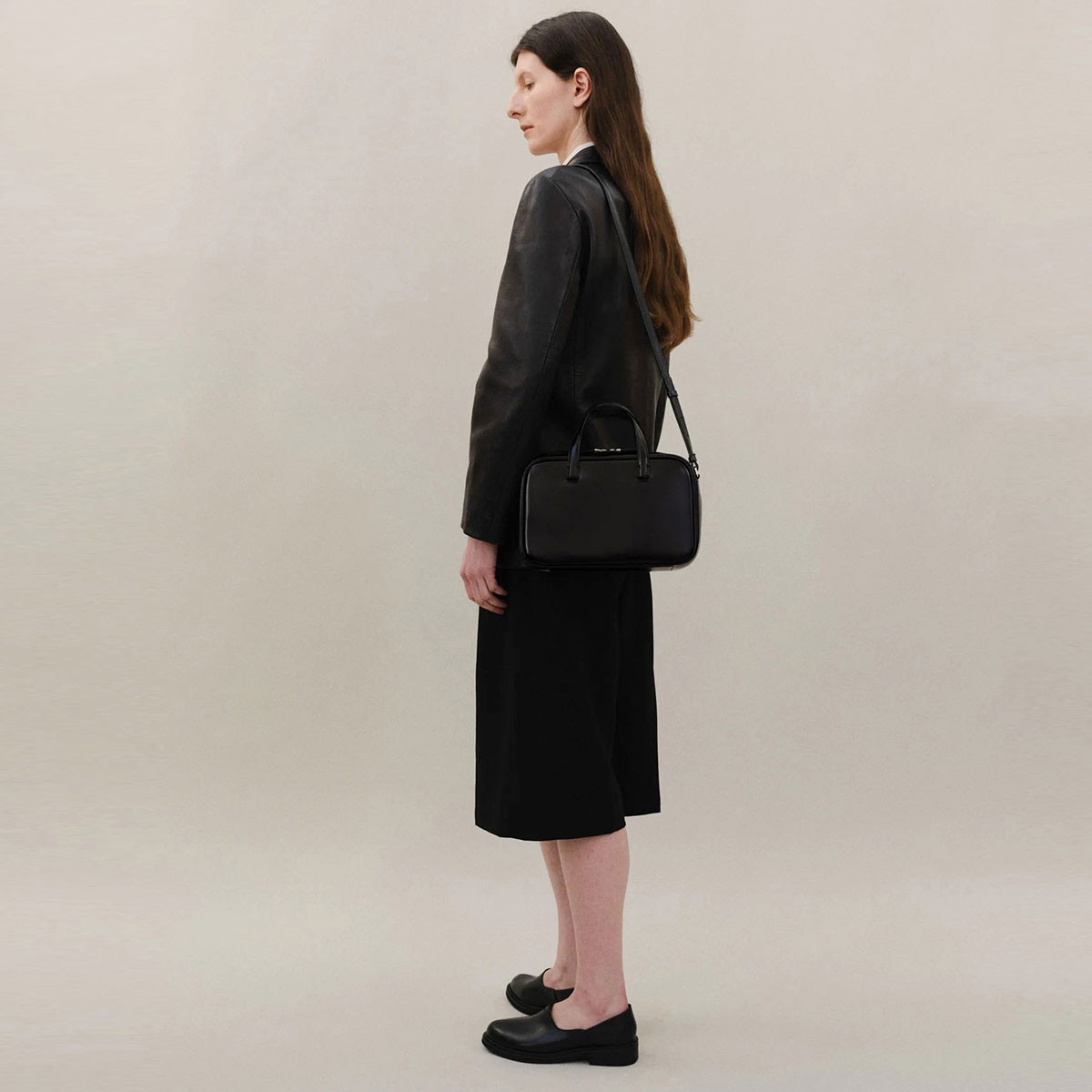ティンケース(缶ケース)のようなユニークな形から着想を得たデザインの、2WAYトートバッグミディアムサイズ。クラシックさと遊び心を兼ね備え、光沢感のあるレザーが上品な印象を演出します。広めのマチと底まで大きく開くジップ仕様で、荷物の出し入れもスムーズ。見た目以上の収納力も魅力です。バッグの内側にはレザーのサイドガードを備え、ジッパーを大きく開けても中身がこぼれにくく安心。取り外し可能なストラップ付きで、手持ちのトートとしても、クロスボディとしても2WAYでお使いいただけます。
