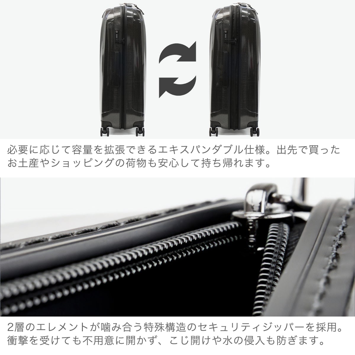 ・エキスパンダブル機能付きの製品は、マチ拡張時の3辺の和が機内持ち込みサイズ、預け入れ無料サイズを超える場合がございます。また、航空会社や飛行機の機種などによって規定が異なりますので、予めご確認の上お求めください。