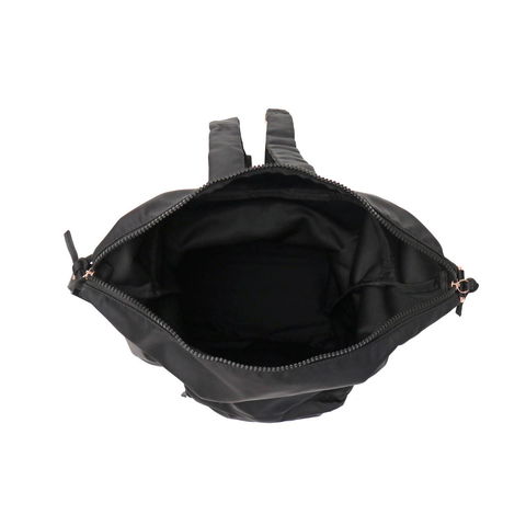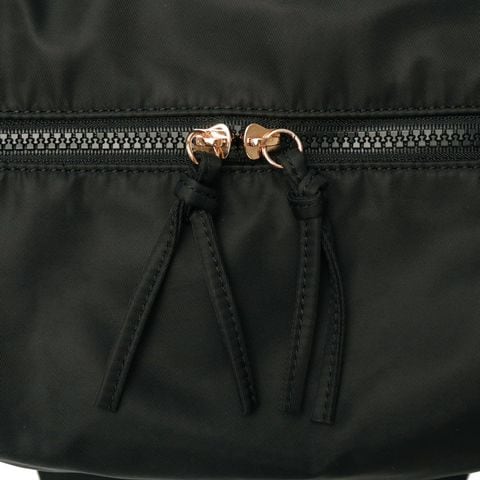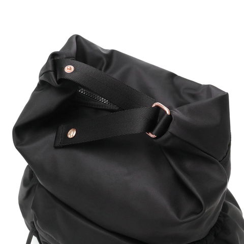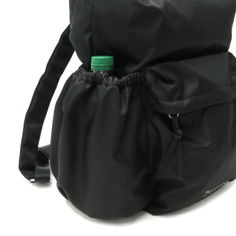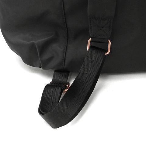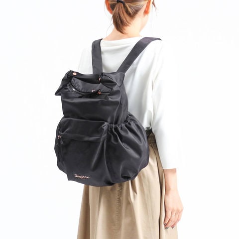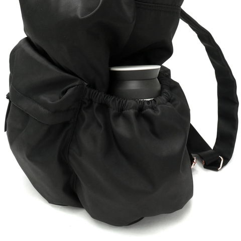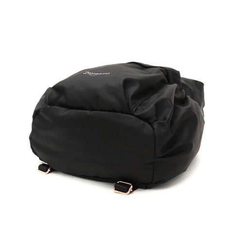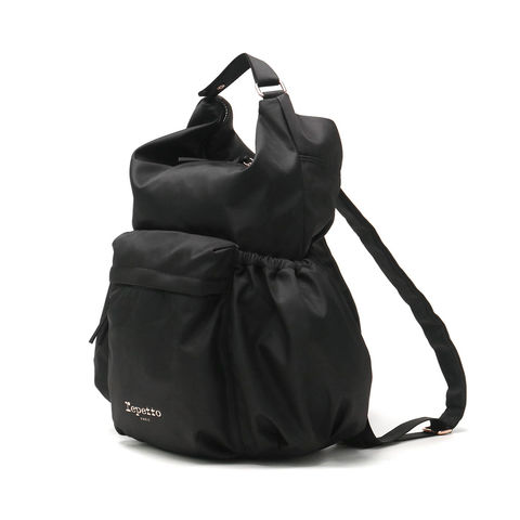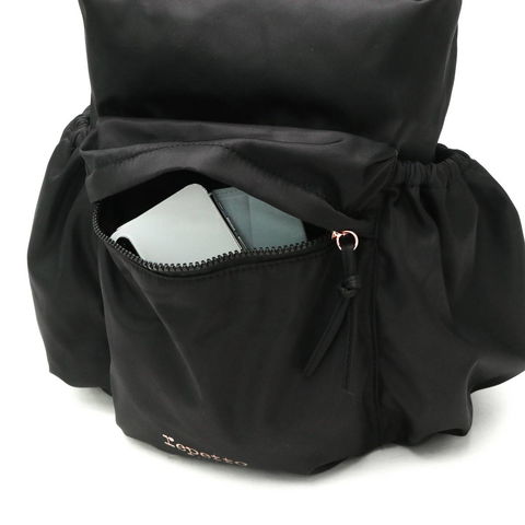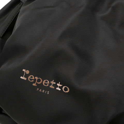 サイドにほどこしたギャザーで、ふっくらとした愛らしいフォルムに仕上げたバックパック。上品な光沢感のあるシンプルな生地に、さりげないRepettoのロゴが映える大人可愛いデザインです。開口部をベルトで留めると持ち手になる形がポイントで、機能性とデザイン性を兼ね備えたアイテムとなっています。