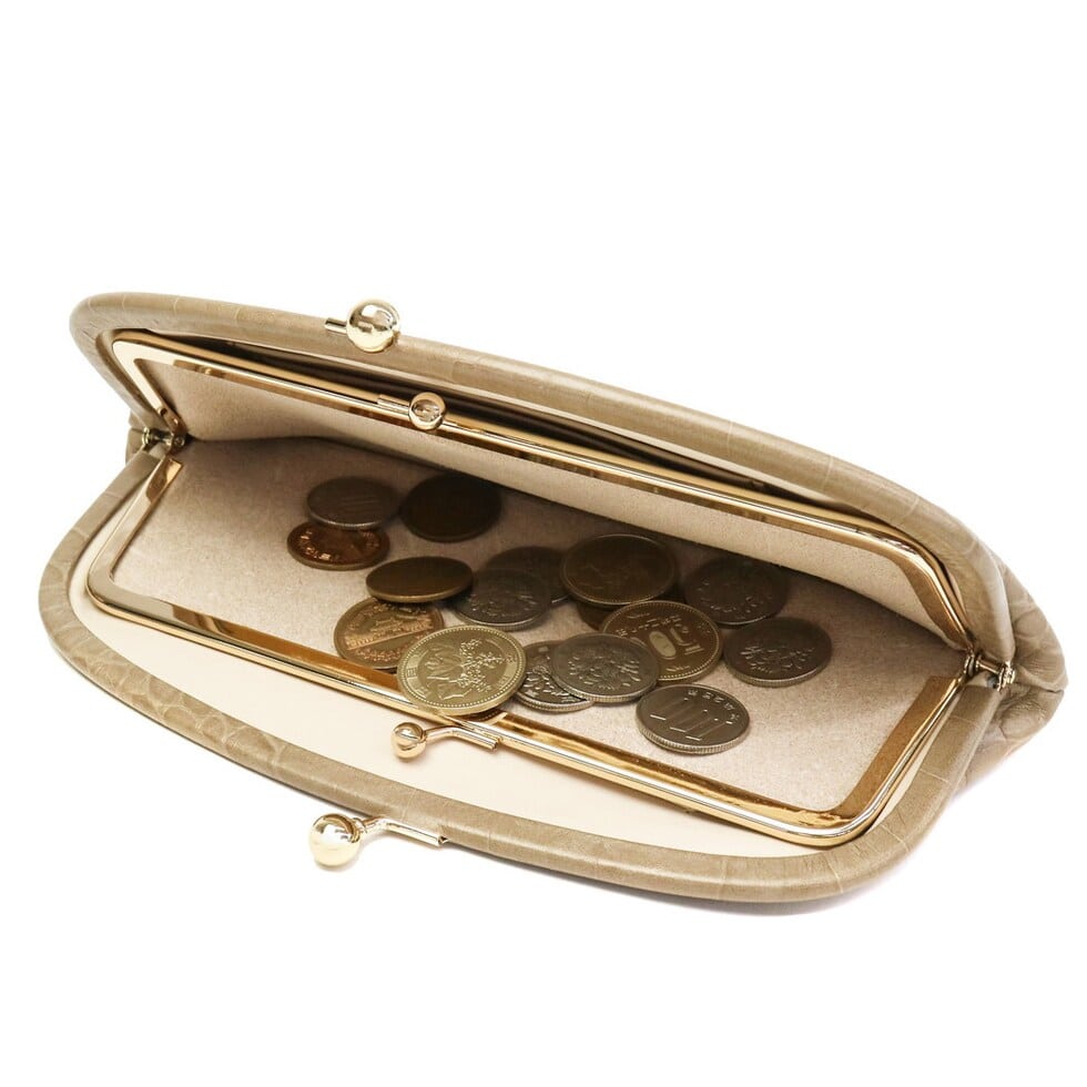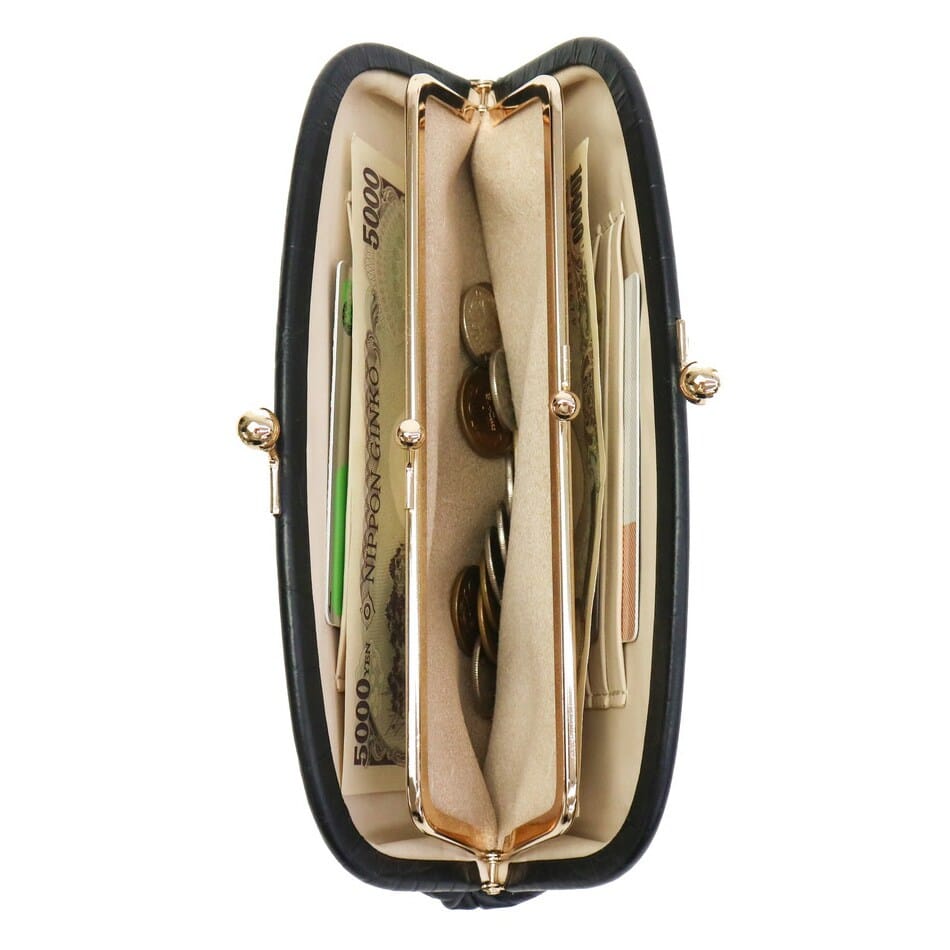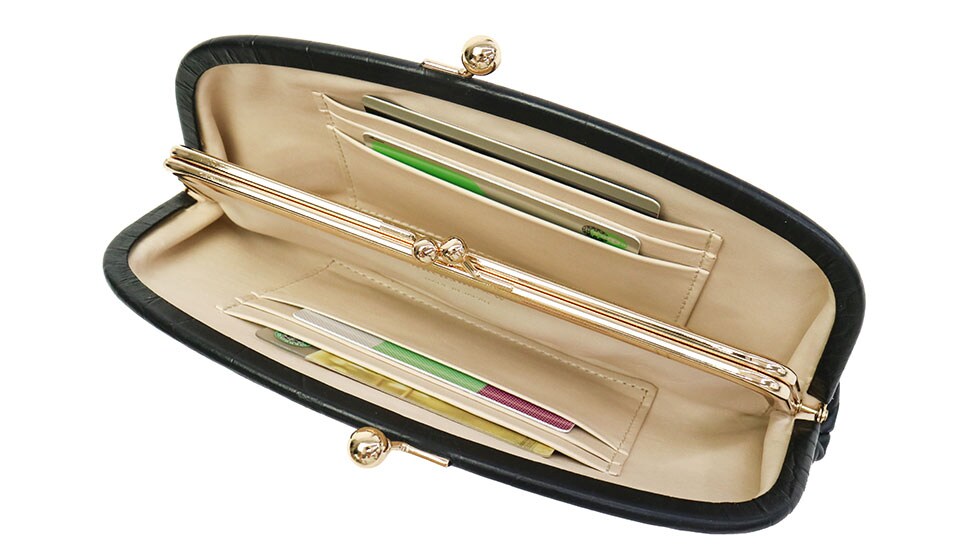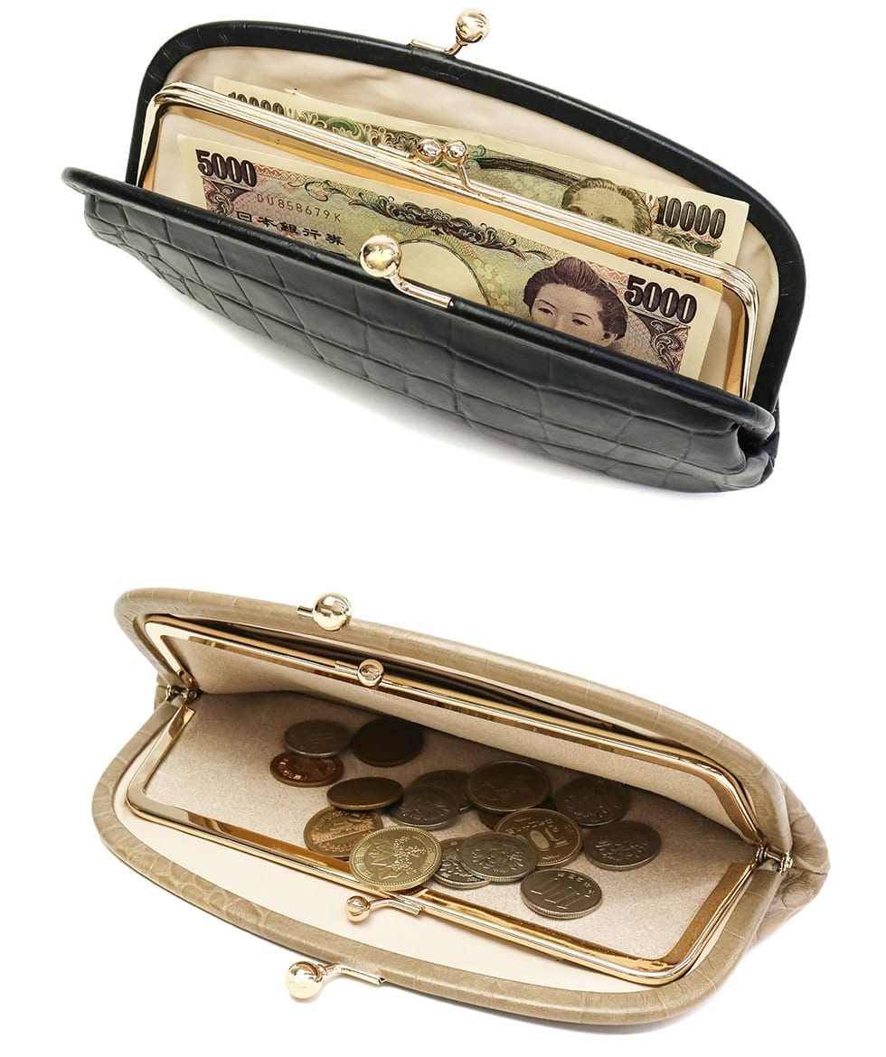 口がぱかっと大きく開くがま口タイプは、視認性に優れ紙幣などの取り出しもスムーズに行っていただけます。お札入れは2ヶ所に分かれているので、金額別に管理が可能。さらに、小銭入れの開口部もがま口になっており、隅々まで見渡せるデザインです。
