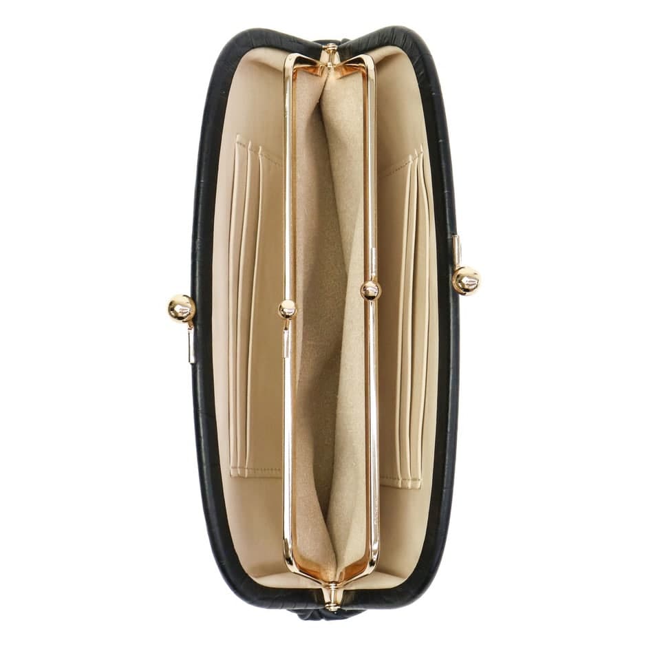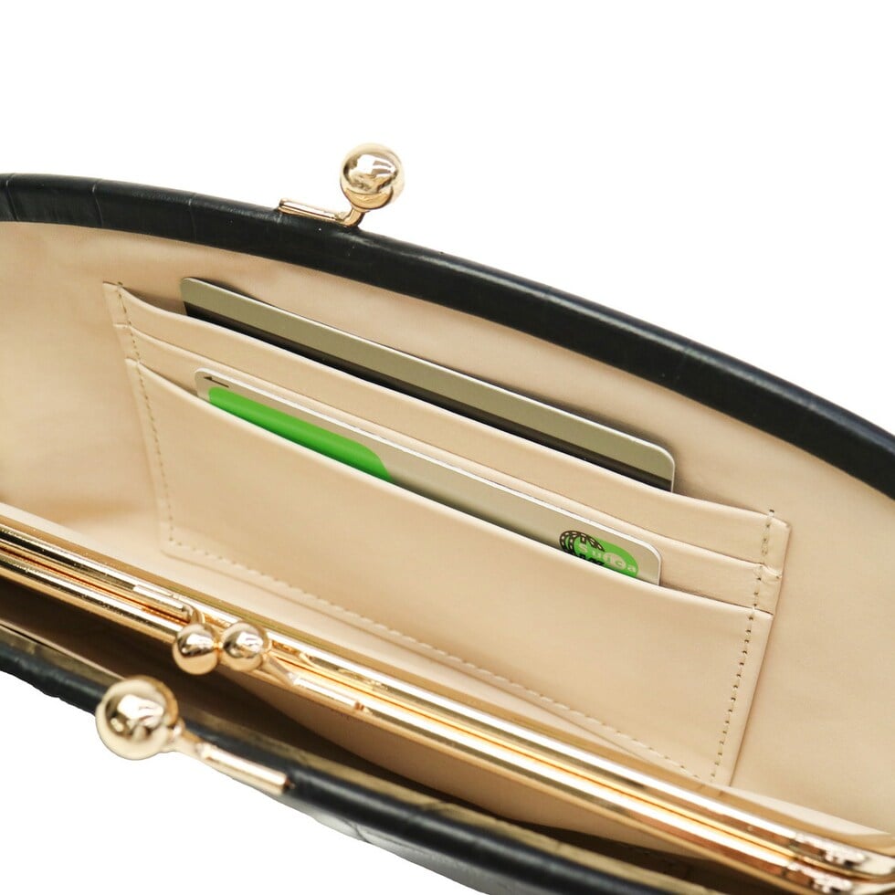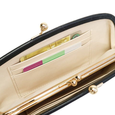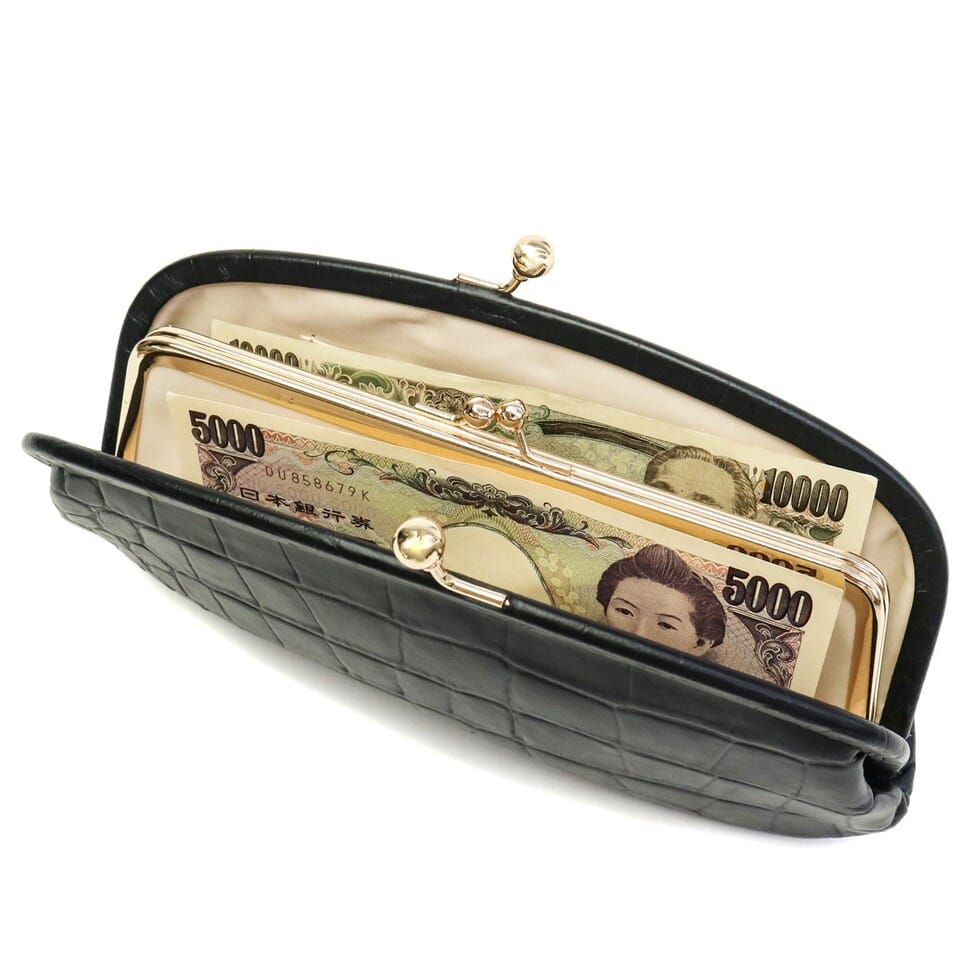 口がぱかっと大きく開くがま口タイプは、視認性に優れ紙幣などの取り出しもスムーズに行っていただけます。お札入れは2ヶ所に分かれているので、金額別に管理が可能。さらに、小銭入れの開口部もがま口になっており、隅々まで見渡せるデザインです。