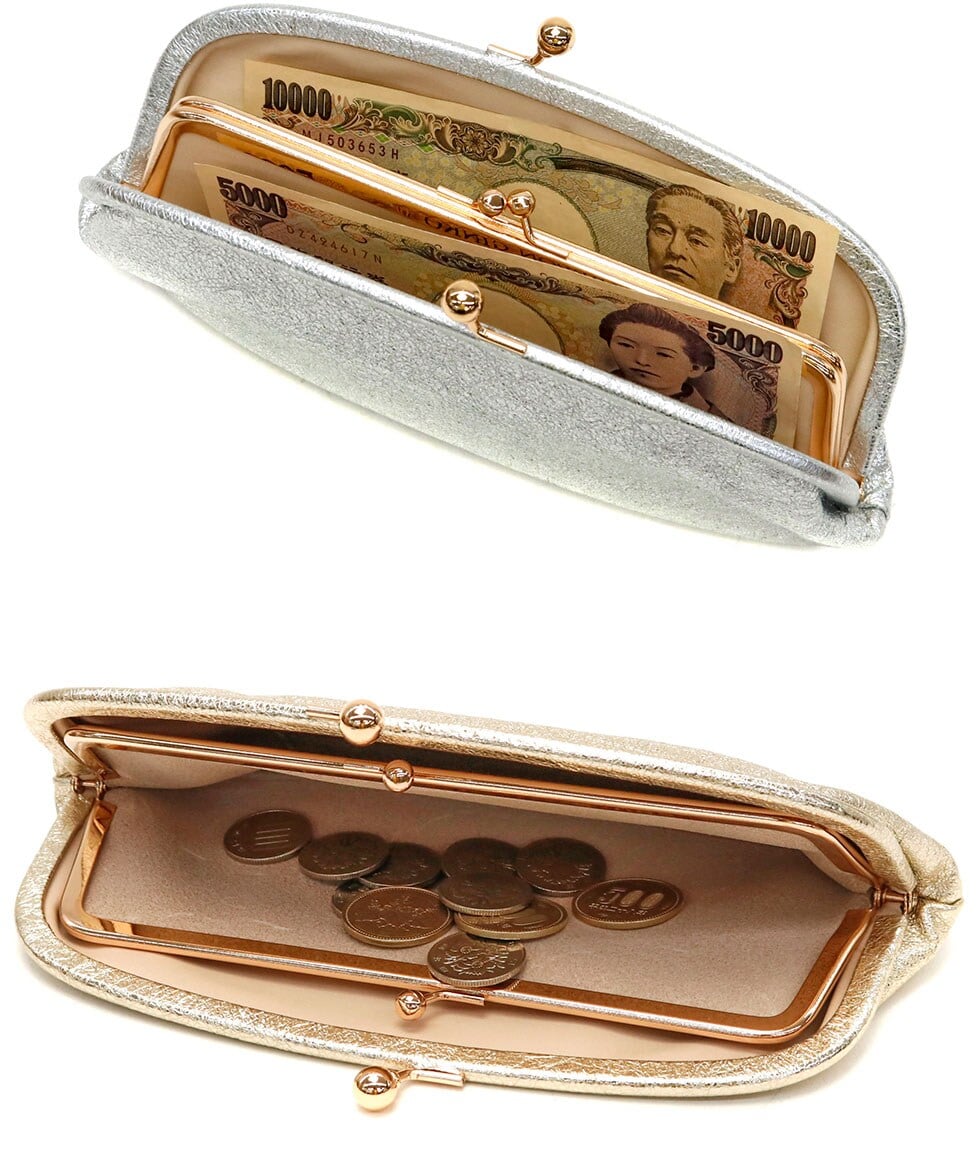 本体を開くと、内側にもがま口があるユニークなデザインです。本体・小銭入れ共にがま口で大きく開くので、中が見やすく、出し入れをスムーズに行えます。また、中央の小銭入れが仕切りとなり、紙幣を種別に管理することも可能です。