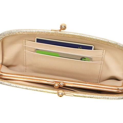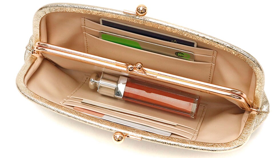 カードポケットは少し大きめに作られており、入れるときに引っかかることなくスムーズに収納できます。細身のフォルムながら金銭やカード以外にもリップなどの小物も納まるので、ランチタイムやちょっとした外出にはこれ一つで身軽に出かけられます。