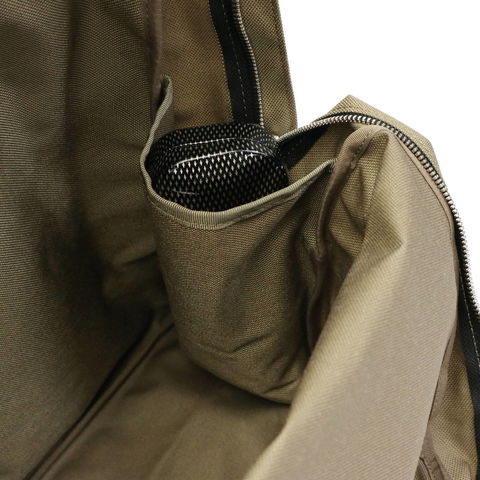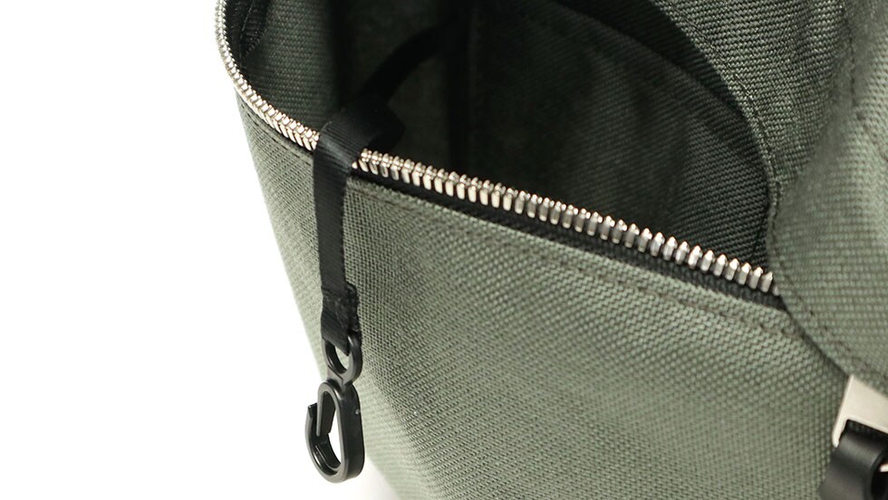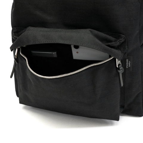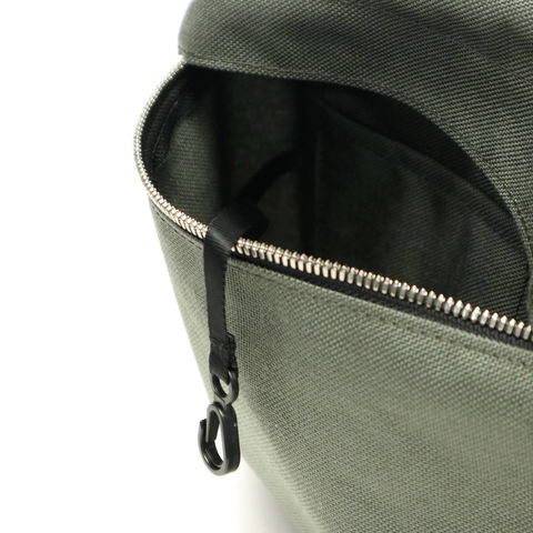 前ポケットのキーフックは、鍵を付けたままでも使用できるように長めにアップデート。その他にも、STDのロゴを入れたオリジナル引手や、端までスムーズに開閉できるようファスナーフラップの両端を斜めにカットするなど、細部までこだわりのあるつくりです。