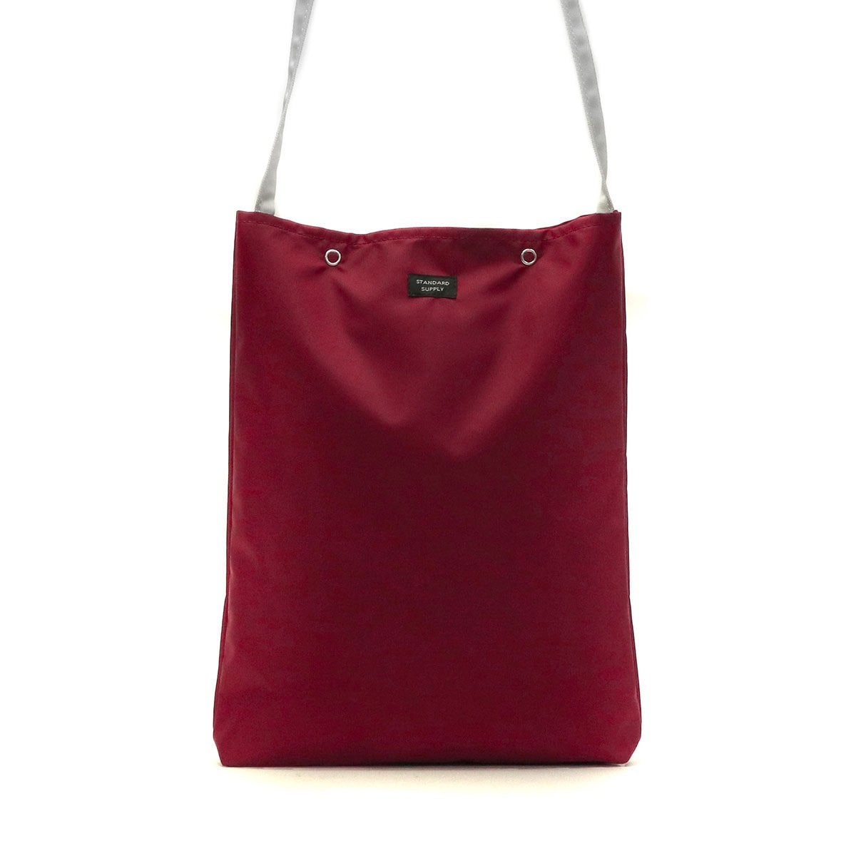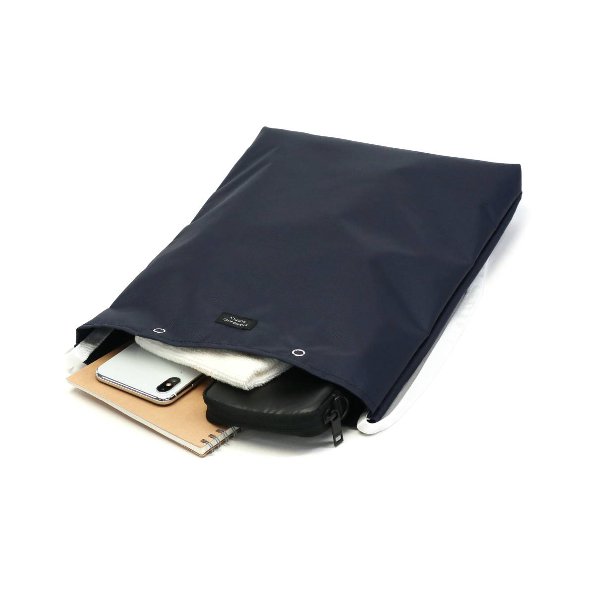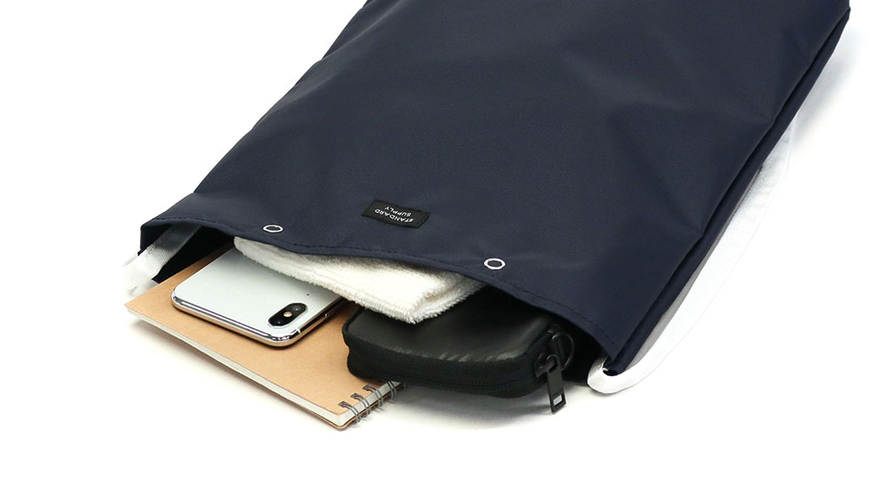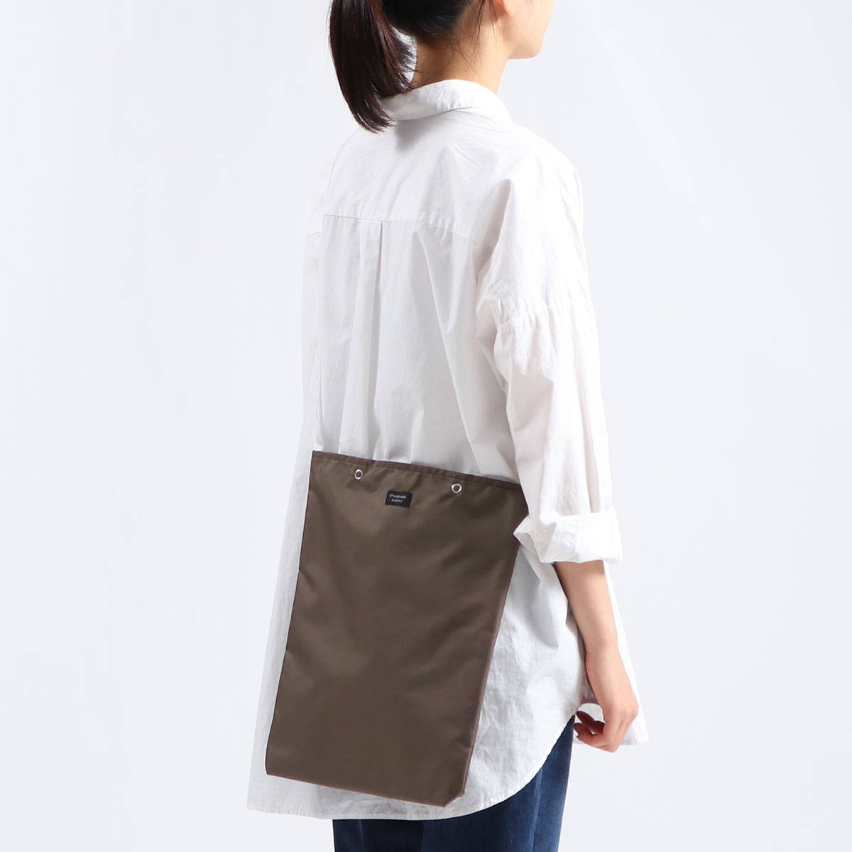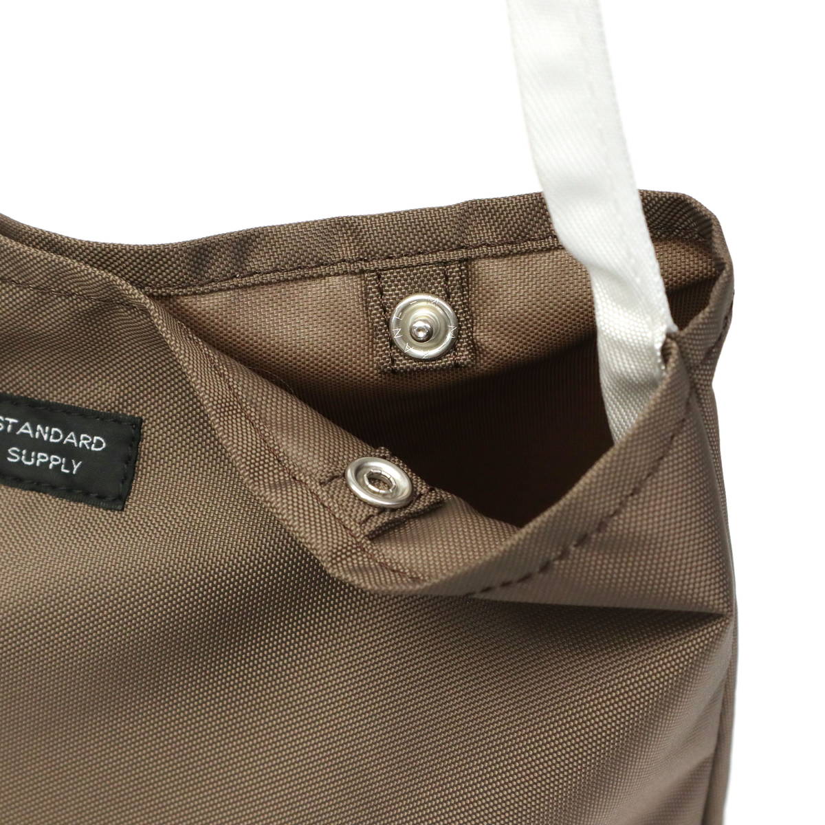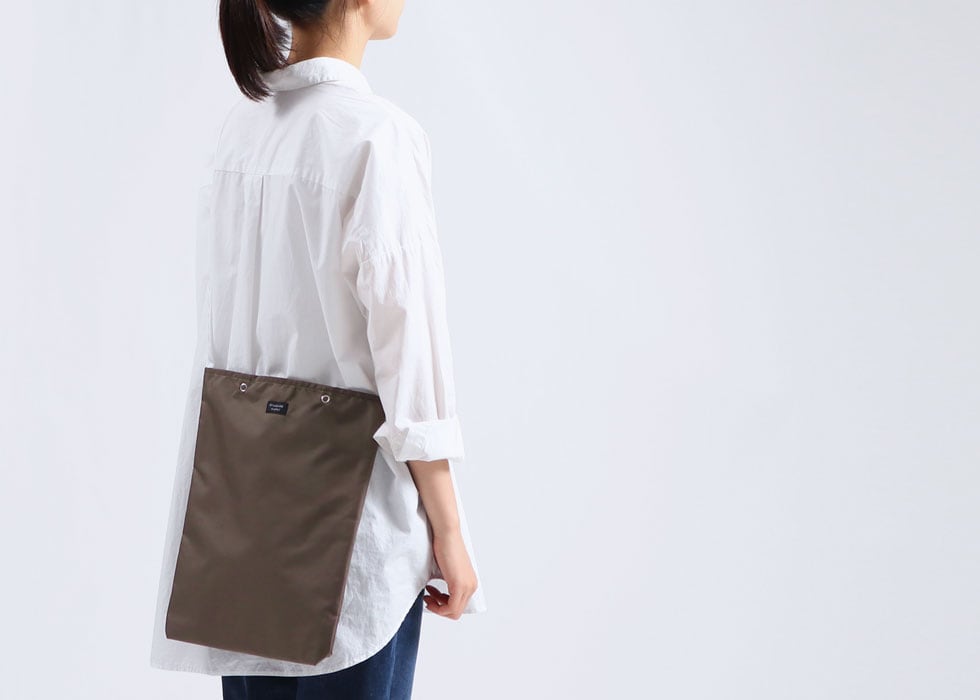 収納スペースはA4に対応し、口元はスナップボタンで留めることが可能。マチが薄く持った時にかさばらないため、お財布やスマートフォンなどを入れてサッと持ち歩きやすい仕上がりです。また、ショルダーは見た目以上に強度があり結ぶことでスタイルに合わせた長さでお楽しみいただけます。