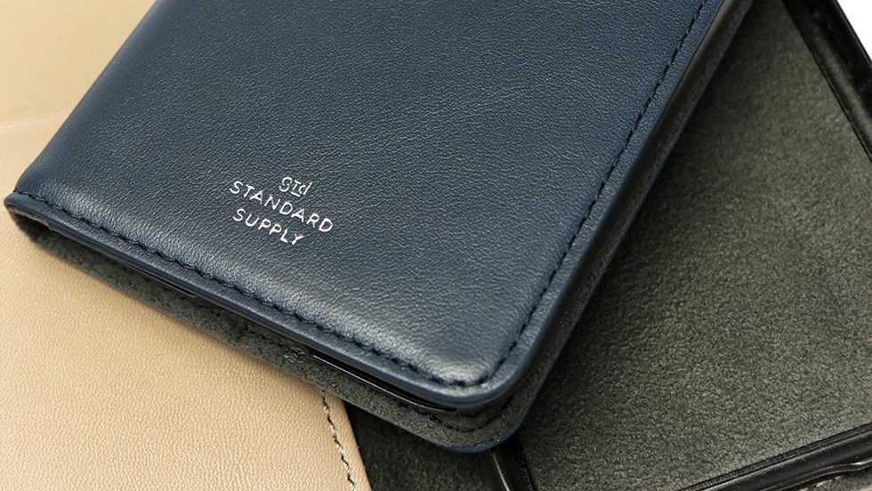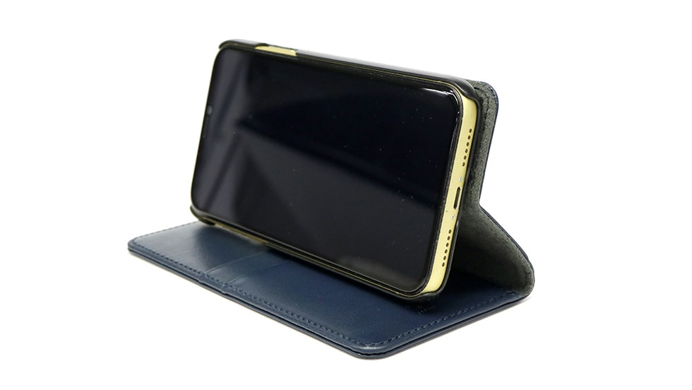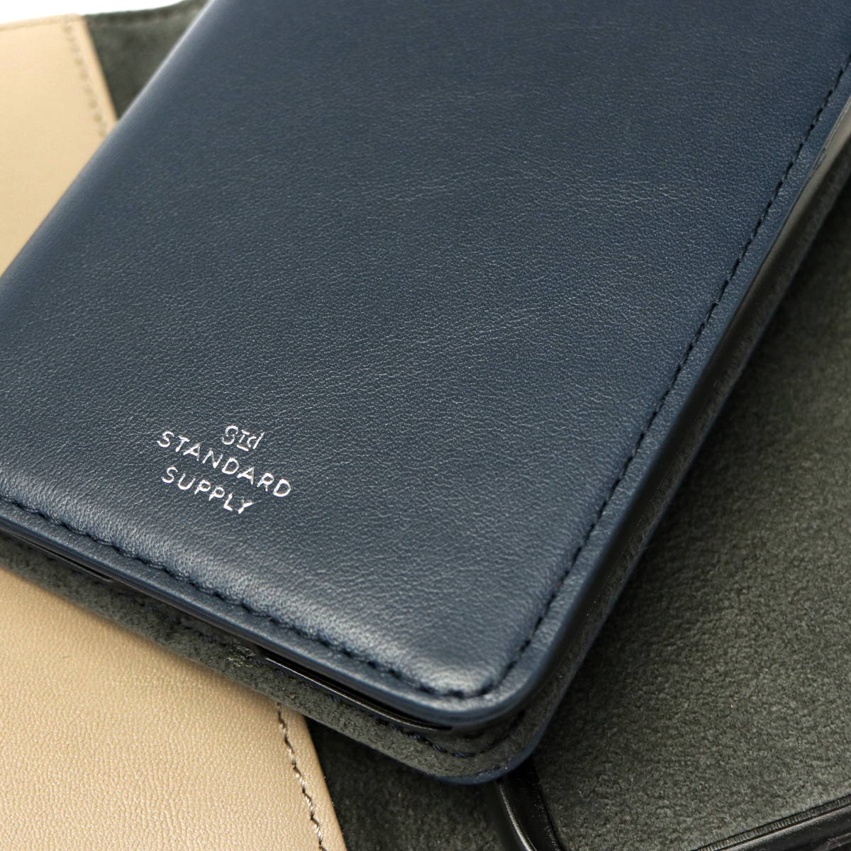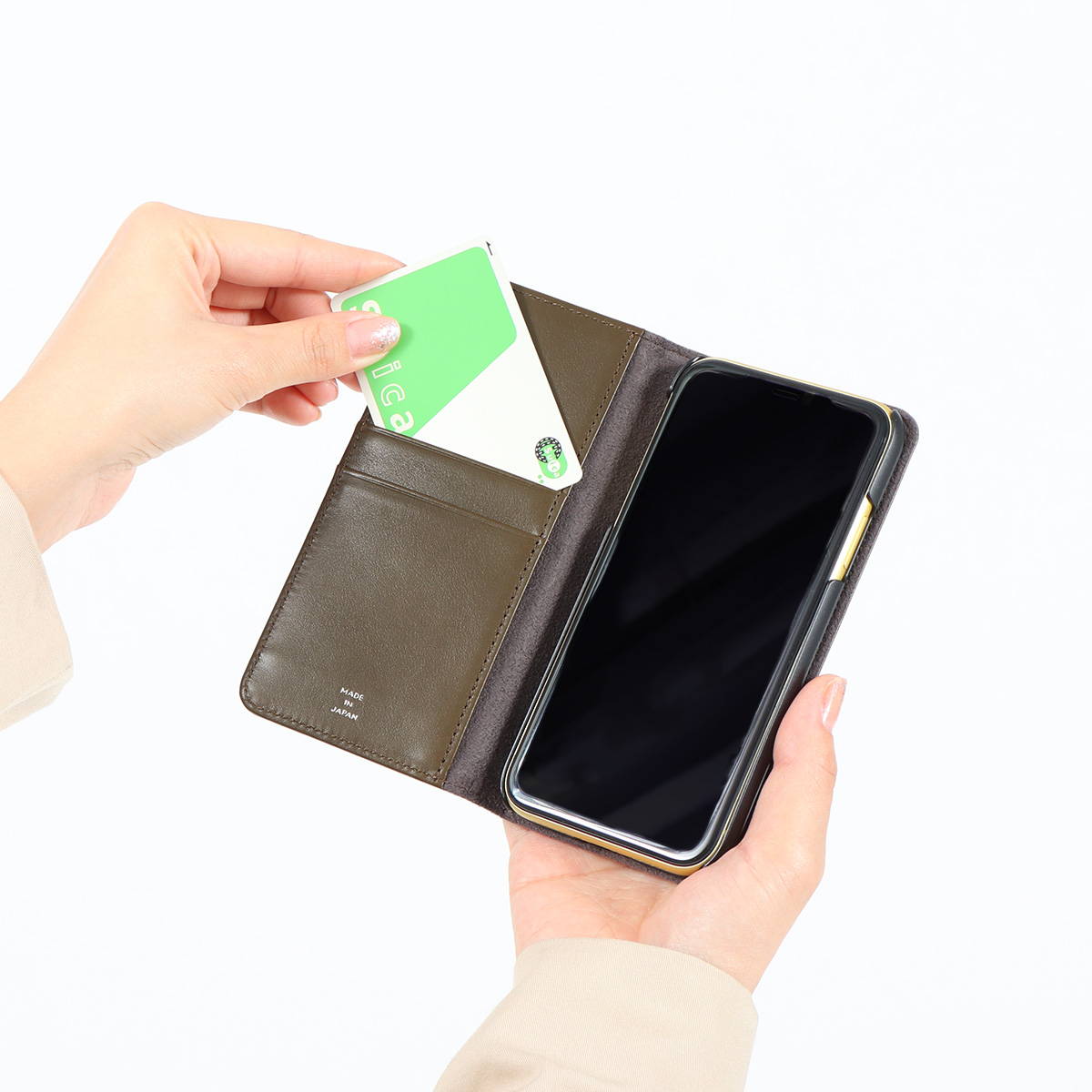 メイン素材には、イタリア製のナッパレザーを採用しています。クロームなめしの特性を生かしたソフトな風合いと、透明感のある発色の良さがこの革の特徴です。裏地の素材には手触りの良い国産のフェイクスウェード生地を使用していますので、端末を装着する際の当たりも柔らかです。