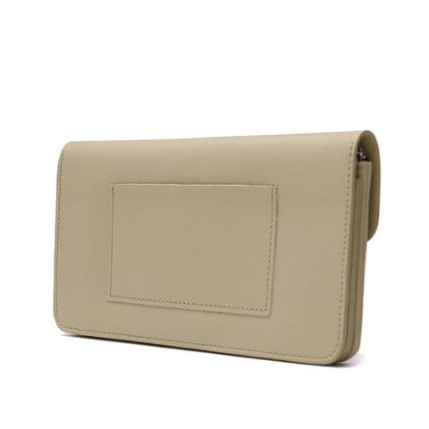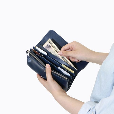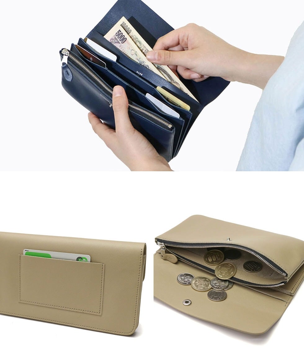 シンプルながらも充実した収納を備えた使い勝手の良い設計。収納部はお札やカードの量に応じて蛇腹状に広がるので、増えがちなカード類もすっきり収納できます。背面に備わるポケットはICカードの収納に便利です。