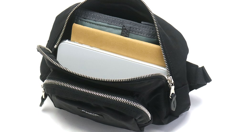 本体は小さめのお財布やスマホなど、小物類をまとめるのに適したサイズ感。フロントに設けたジップポケット内にはさらに小分けポケットとキーフックを備えているので、鍵など細かいものも分かりやすく管理しておけます。