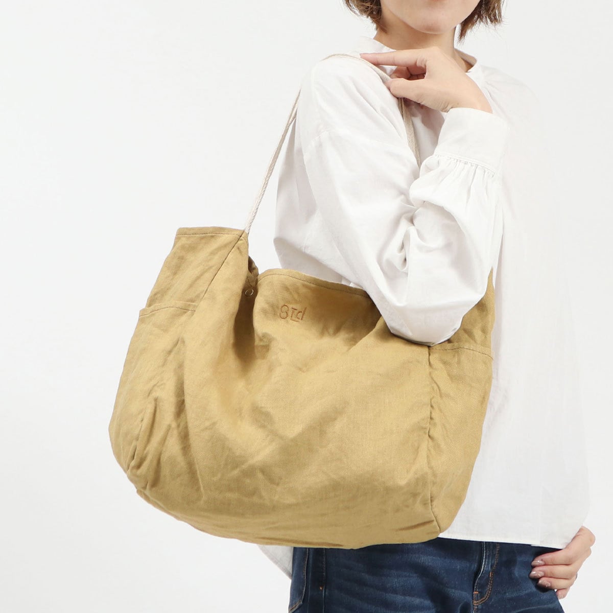 持ち手部分のテープは本体の風合いに近い「麻30%とレーヨン70%」の混紡テープを使用し、より雰囲気のある仕上がりに。内側のまとめから続いているので強度があり、安心して使えるのも嬉しいポイントです。また、ブランド初となる刺繍ロゴはリネンの風合いにマッチし、デザインのワンポイントになっています。