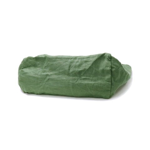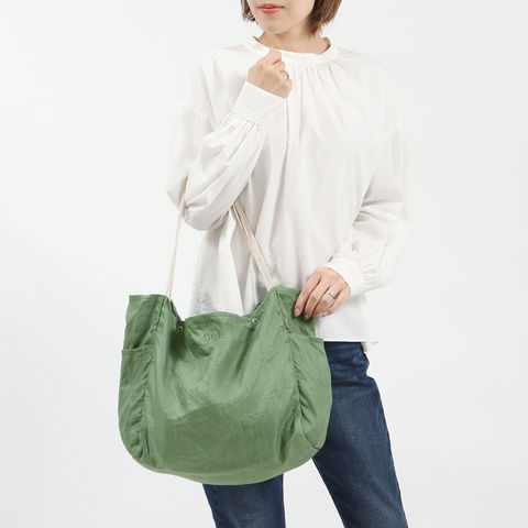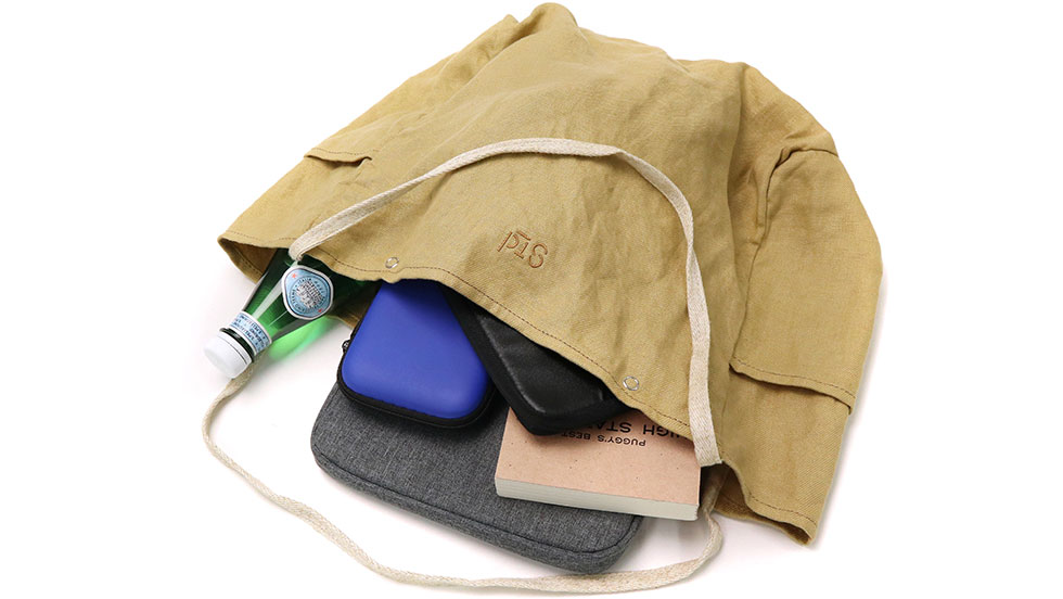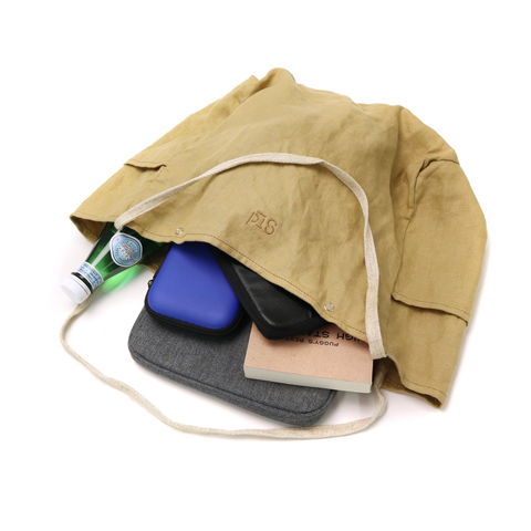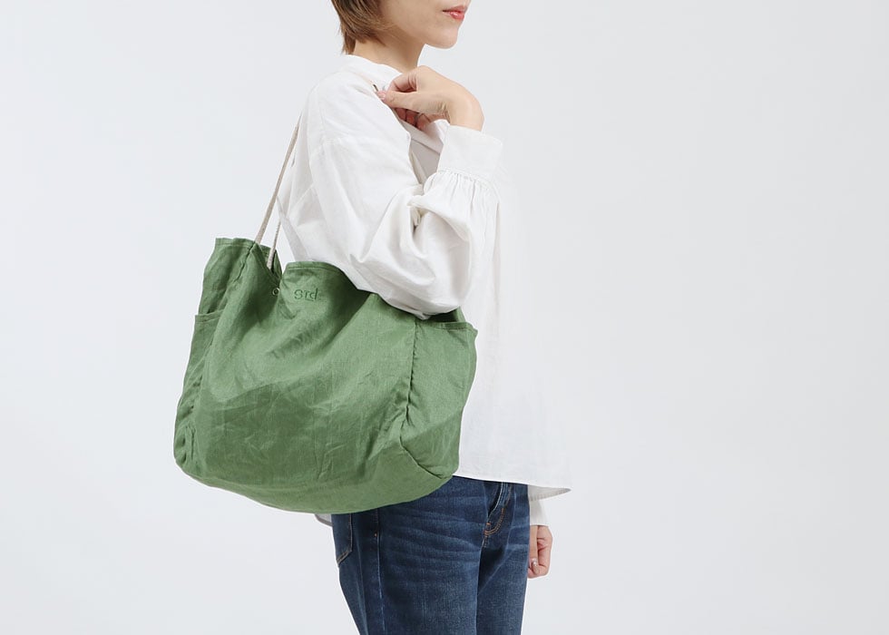 素材には滋賀県湖東地区で織られた綾織の麻素材を使用。しなやかで上品な光沢が目を引きます。縫い上がった製品を一度洗いにかける「製品洗い」を施しているのも特徴の一つ。製品洗いによって生まれる柔らかな風合いはコーディネートに合わせやすく、長く愛用していたバッグのように自然と馴染んでくれます。