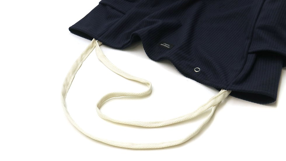 開口部は簡単に留め外しが出来るリング式のスナップボタンで、開閉もスムーズ。A4サイズ対応で幅広なマチ幅を備え、デイリー使いしやすいサイジングとなっています。外側には両サイドにポケットを設け、ペットボトルや折り畳み傘の収納場所としてぴったりです。