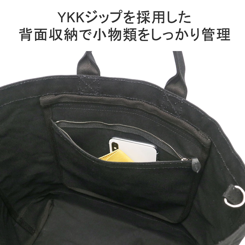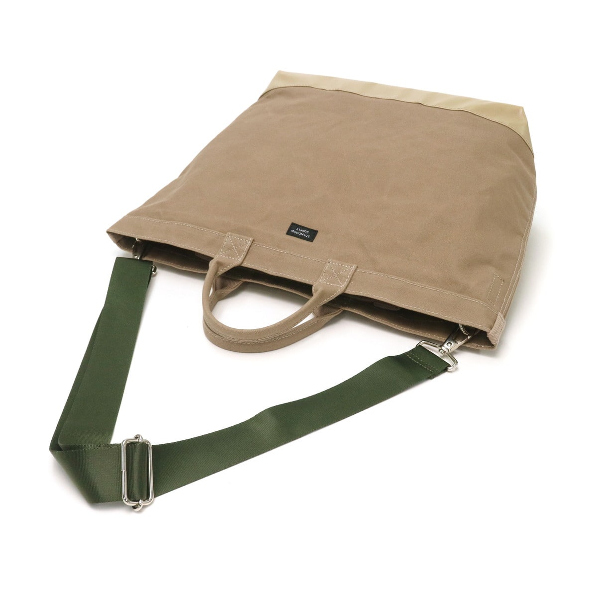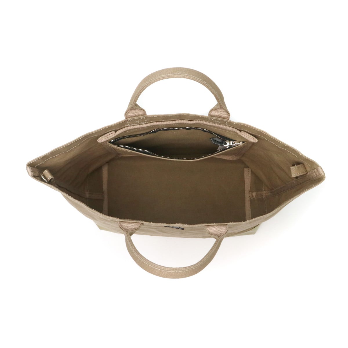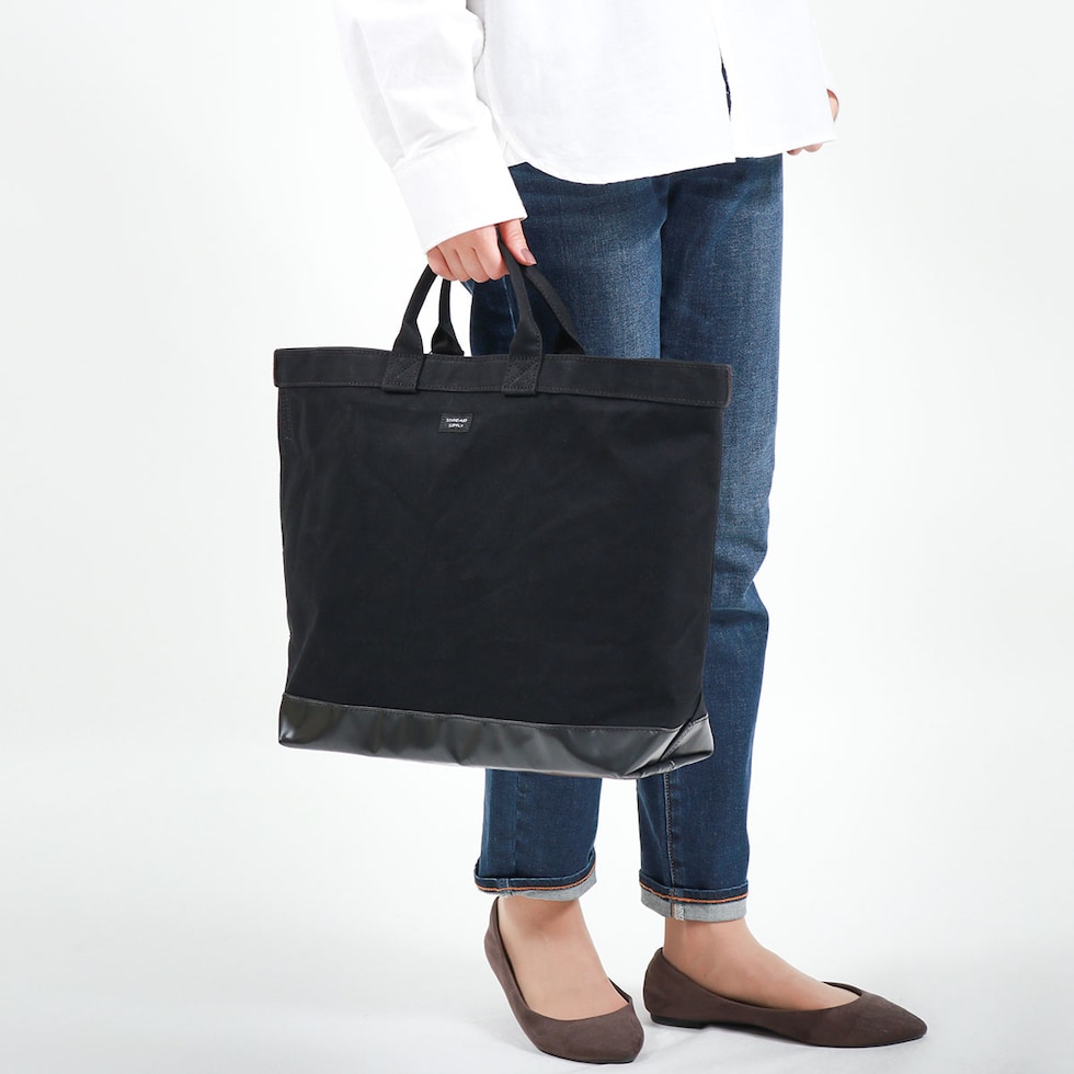 本体はA4サイズが収まるサイズ感。内側の背面にジップ式ポケットを設けた使いやすいシンプルなデザインです。トートバッグとしてはもちろん、取り外し可能なストラップが付属しているためショルダーバッグとしてもお使いいただけます。また表地にはアメリカの軍需物資として靴地やハンモックなどに幅広く活用されている丈夫なキャンバス生地、「ARMY DUCK(アーミーダック)」を採用。そこにパラフィンワックス加工を施すことで、張り感が出るため薄めの生地でもバッグが自立してくれるのは嬉しいポイントです。さらに底面には建築用のオーニングとして屋外でも使われる耐候性、耐久性に優れ防水性も兼ね備えたターポリン素材を使用しています。上品さを感じさせるルックスながら、機能性に優れたタフな仕上がりにより長くご愛用いただけるアイテムになっています。