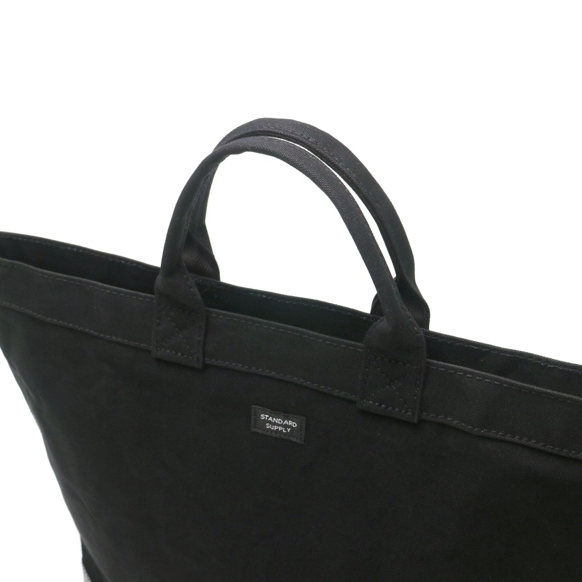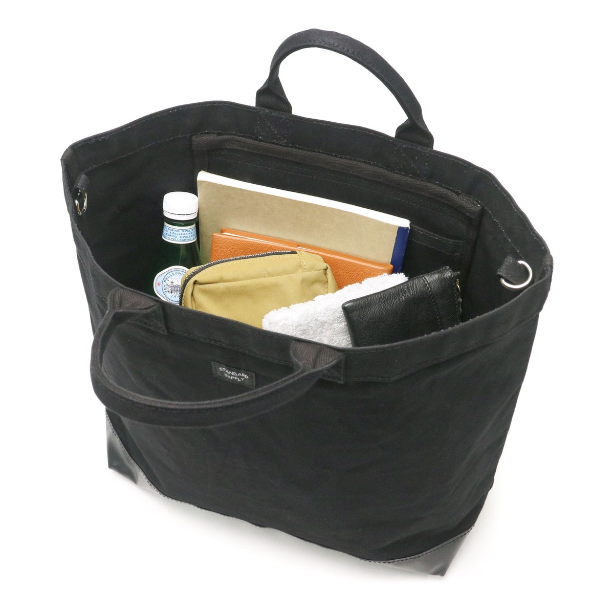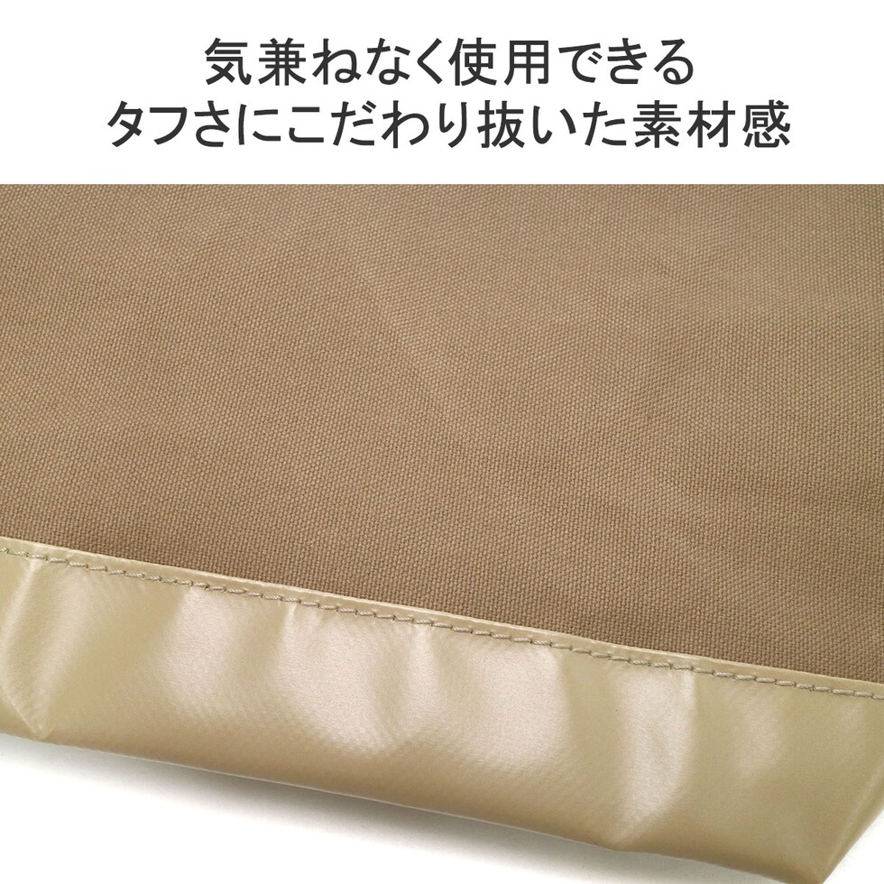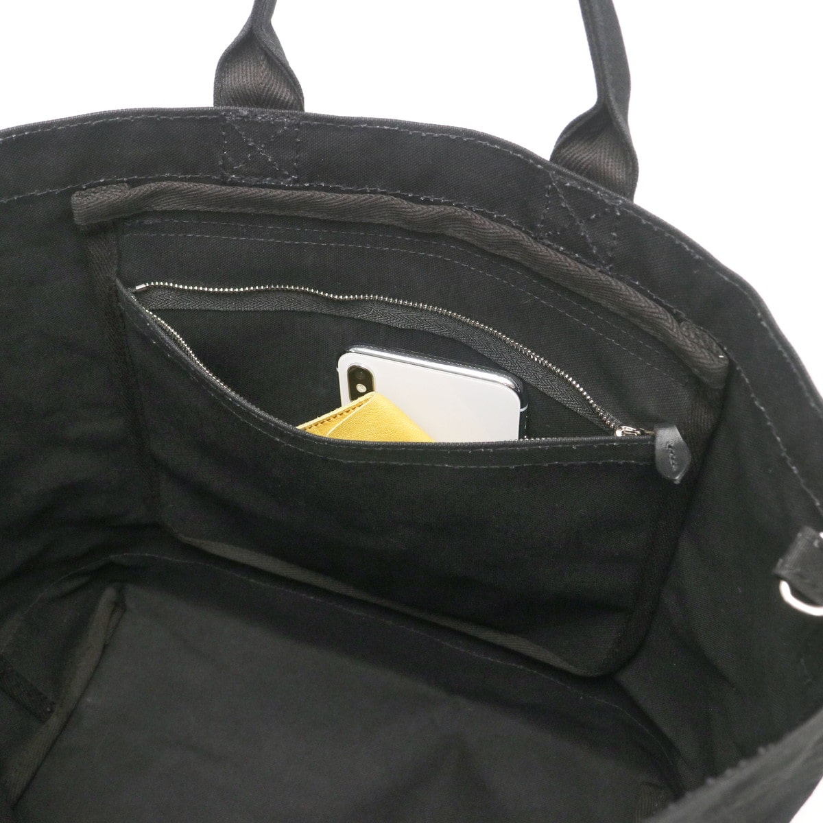 本体はA4サイズが収まるサイズ感。内側の背面にジップ式ポケットを設けた使いやすいシンプルなデザインです。トートバッグとしてはもちろん、取り外し可能なストラップが付属しているためショルダーバッグとしてもお使いいただけます。また表地にはアメリカの軍需物資として靴地やハンモックなどに幅広く活用されている丈夫なキャンバス生地、「ARMY DUCK(アーミーダック)」を採用。そこにパラフィンワックス加工を施すことで、張り感が出るため薄めの生地でもバッグが自立してくれるのは嬉しいポイントです。さらに底面には建築用のオーニングとして屋外でも使われる耐候性、耐久性に優れ防水性も兼ね備えたターポリン素材を使用しています。上品さを感じさせるルックスながら、機能性に優れたタフな仕上がりにより長くご愛用いただけるアイテムになっています。