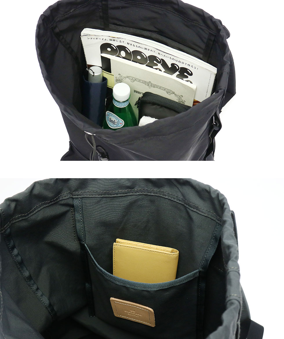 フラップ&ドローコードで開閉できるメインルームは、A4サイズ対応で日常に必要となるアイテムをしっかりと収納可能。内側には小分けポケットも備えています。普段使いはもちろん、通勤・通学などにも使いやすいサイズ感に仕上がっています。