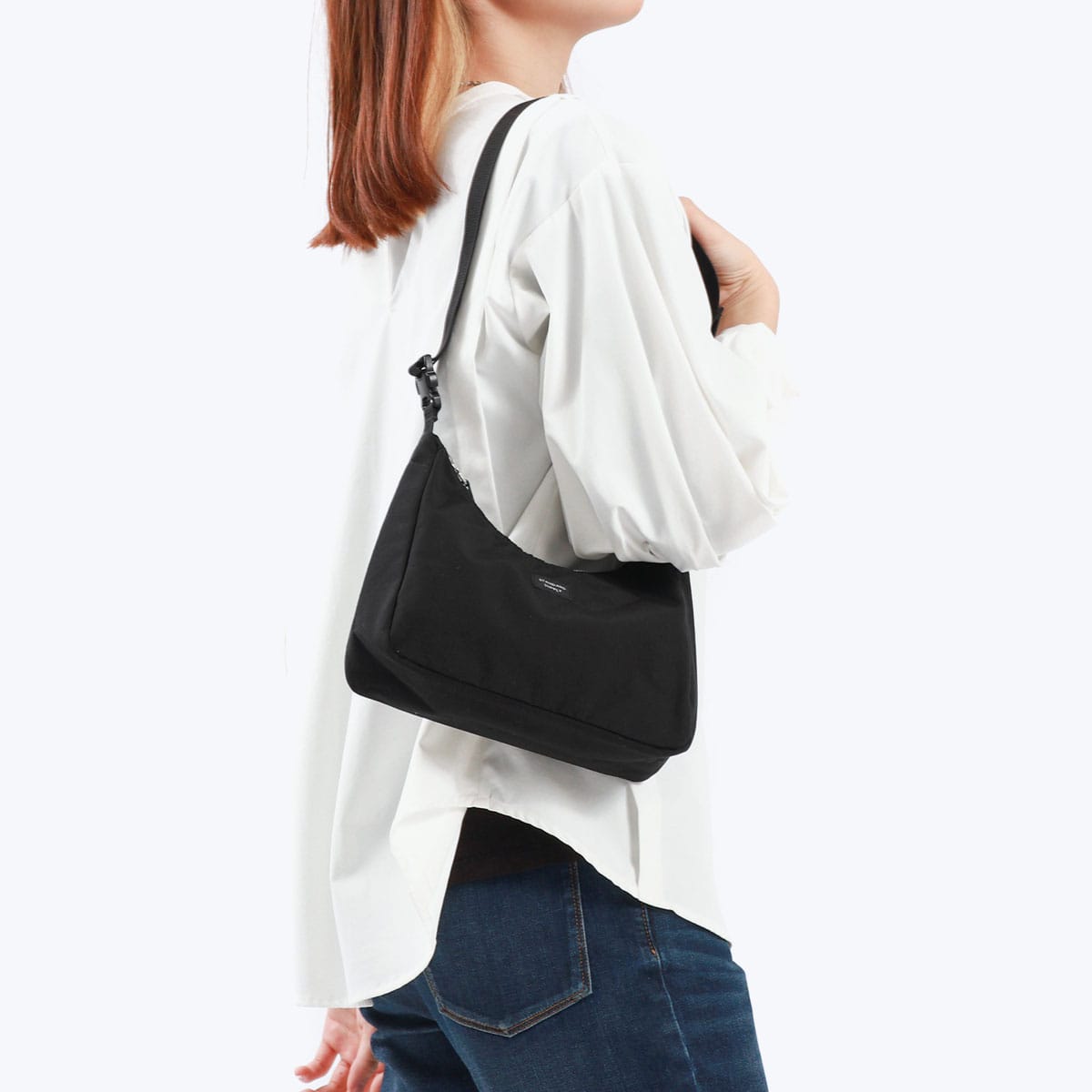 三角形のシルエットが特徴的なミニショルダーバッグです。本体にはアウトドアウェアでも使用される「64クロス」を採用し、軽さとしなやかさ、優れた耐久性を実現。ショルダーストラップの先端を収納できるポケットを設置しているため、お好みの長さに調整して様々なスタイルで持ち運べることができます。