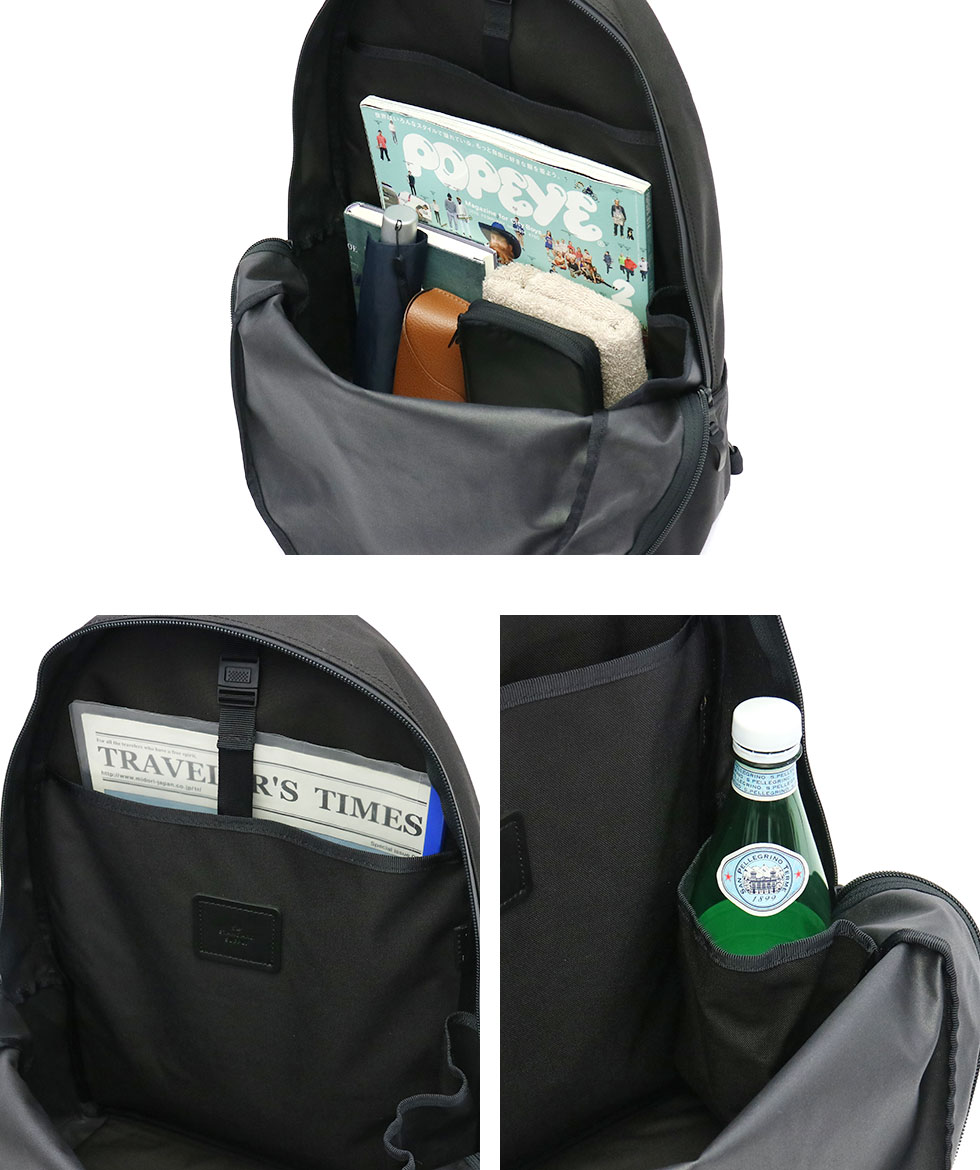 収納部はB4サイズがちょうど収まり、多めの荷物もたっぷり入るサイズ感です。内部にはボトル類の収納に便利な筒状になったオープンポケット、口元がバックル仕様になったポケットを装備しています。こちらのポケットにはA4サイズのクリアポケットも収まり、分けておきたい資料などの保管に便利です。
