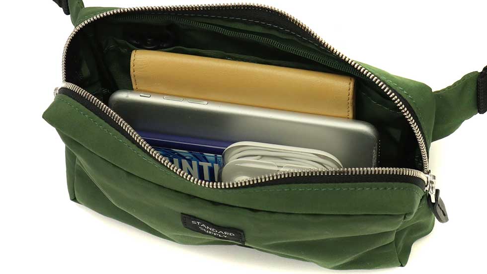 収納部はミニウォレットとスマートフォン、鍵が収まるコンパクトサイズ。必需品のみを持ち歩きたい際に最適で、ポケット感覚でお使いいただけます。内部にはポケットを1ヶ、キーフックを1ヶ設けており、コンパクトながら気の利くつくりが魅力的です。