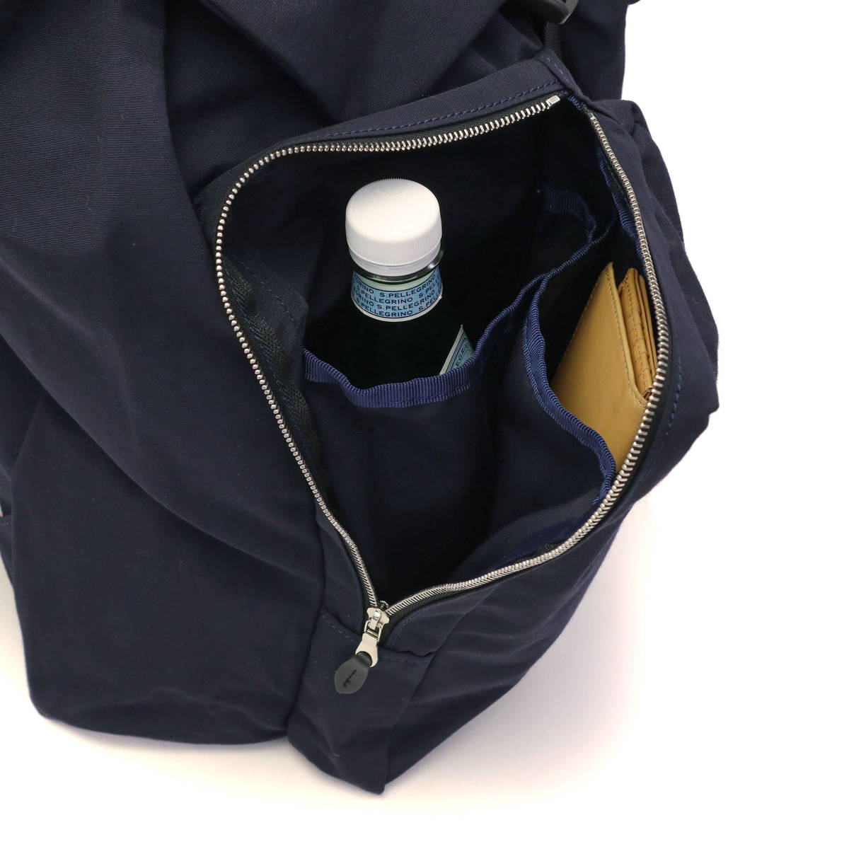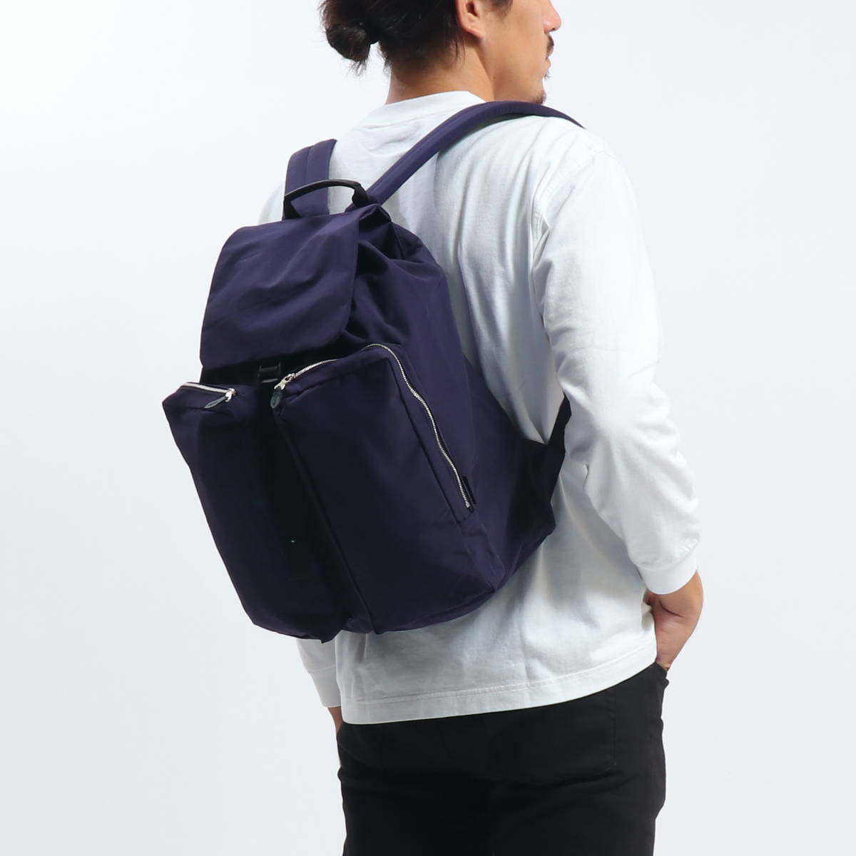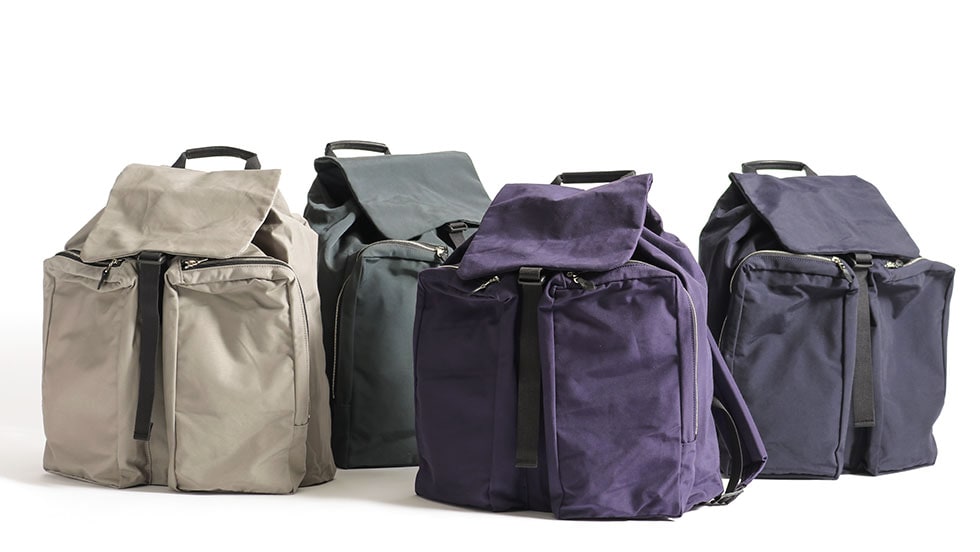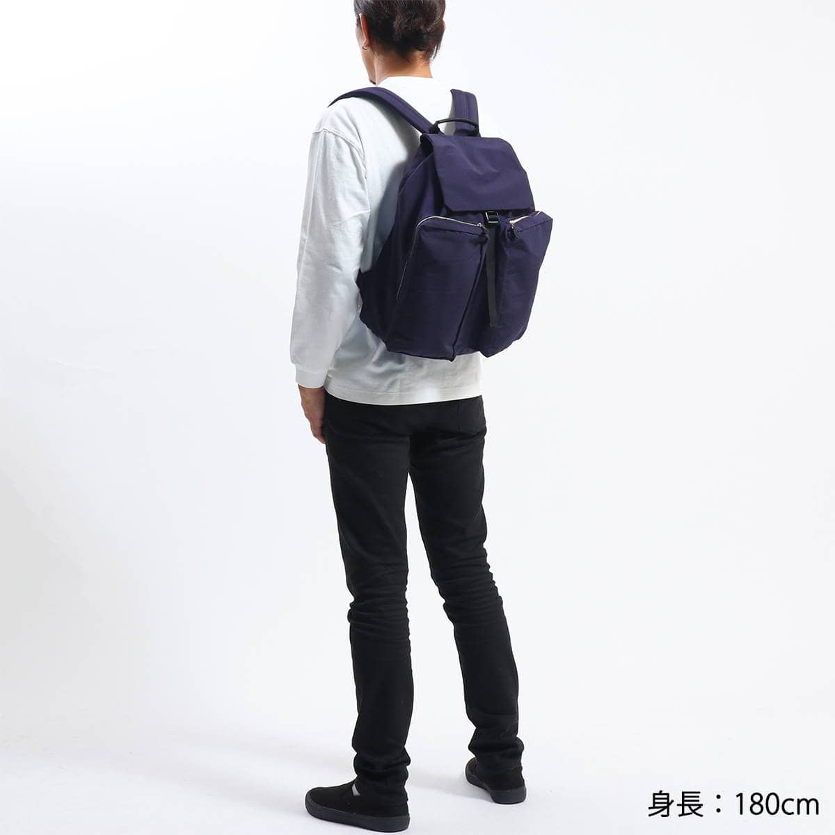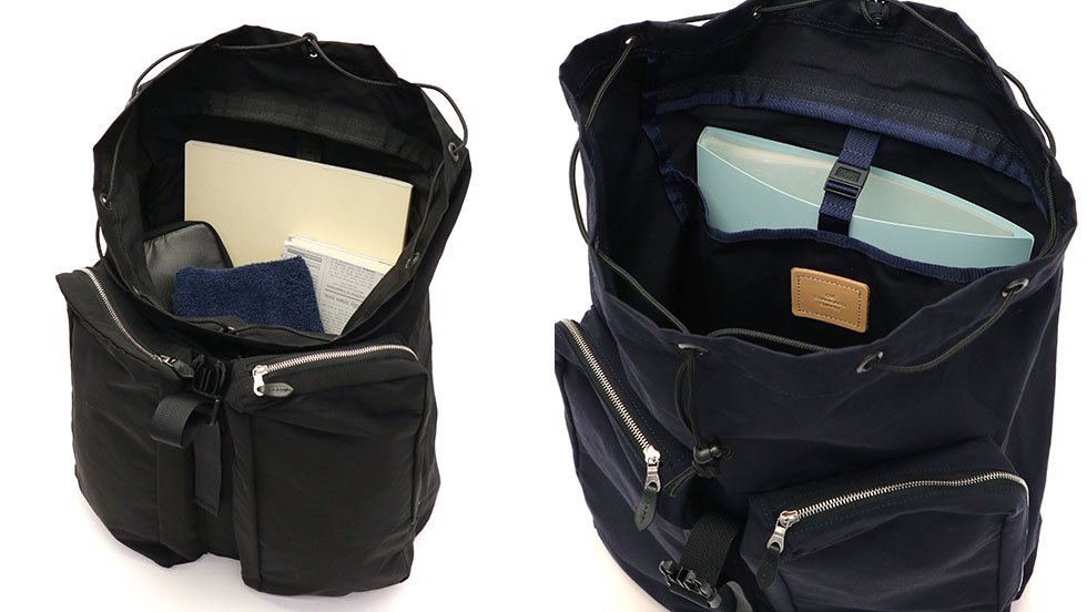 収納口は、フラップのついた型で口元が巾着仕様になっています。収納スペースはB4サイズに対応し、広々としたマチを設け荷物をザックリ収納可能。内装にはバックルポケットが備わっており、A4サイズのファイルなどわけてしまえます。非常に軽くて持ち運びやすく、デイリーから旅行にもオススメです。