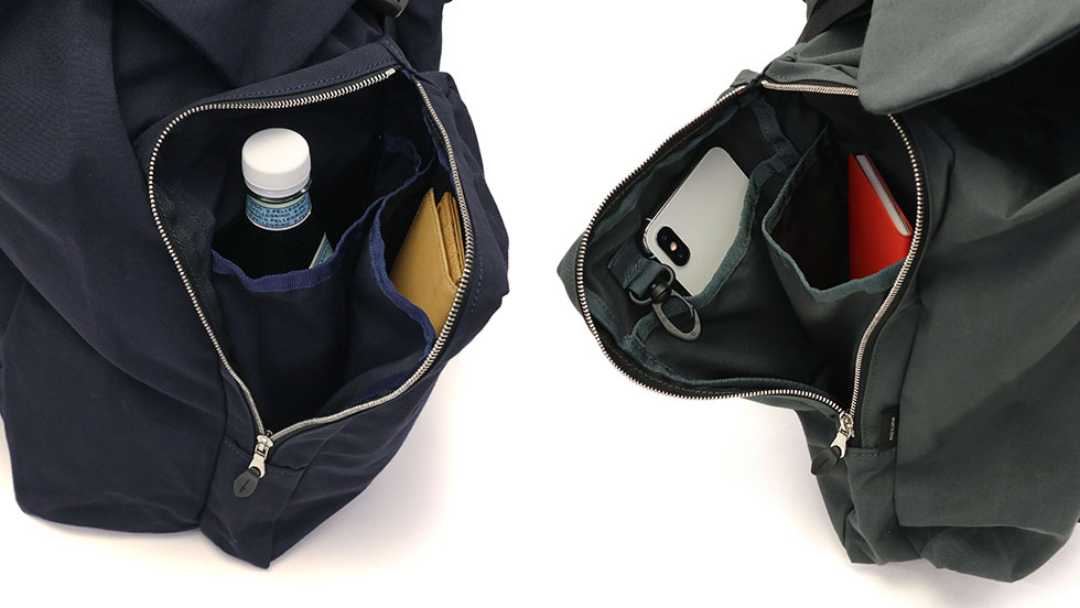 正面ポケットの内側には、ペッドボトルなどが収まる仕切りや、スマートフォンや小物の収納に役立つ小分けポケット、鍵などが付けられるフックを備えています。片方に肩かけしながら荷物の出し入れがしやすいように、ファスナーがL字になっているところもポイントです。