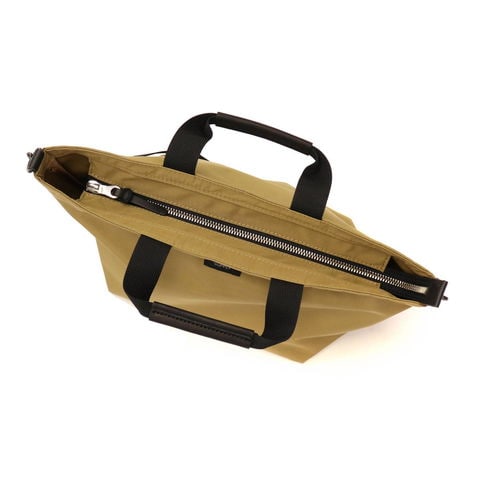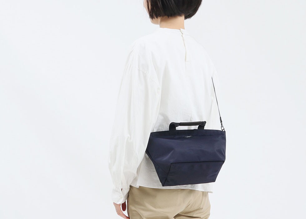 収納口は、中の荷物が見えないようファスナー付きの天マチ仕様となっています。収納部は、長財布やスマートフォン、A5サイズの手帳など必須アイテムの収納にぴったり。広々としたマチを設けているのでお弁当など幅のある荷物もしまいやすく、ランチトートやサブバッグとしても活躍してくれます。