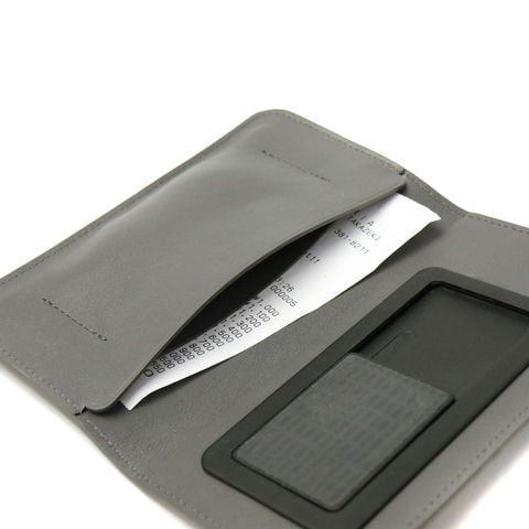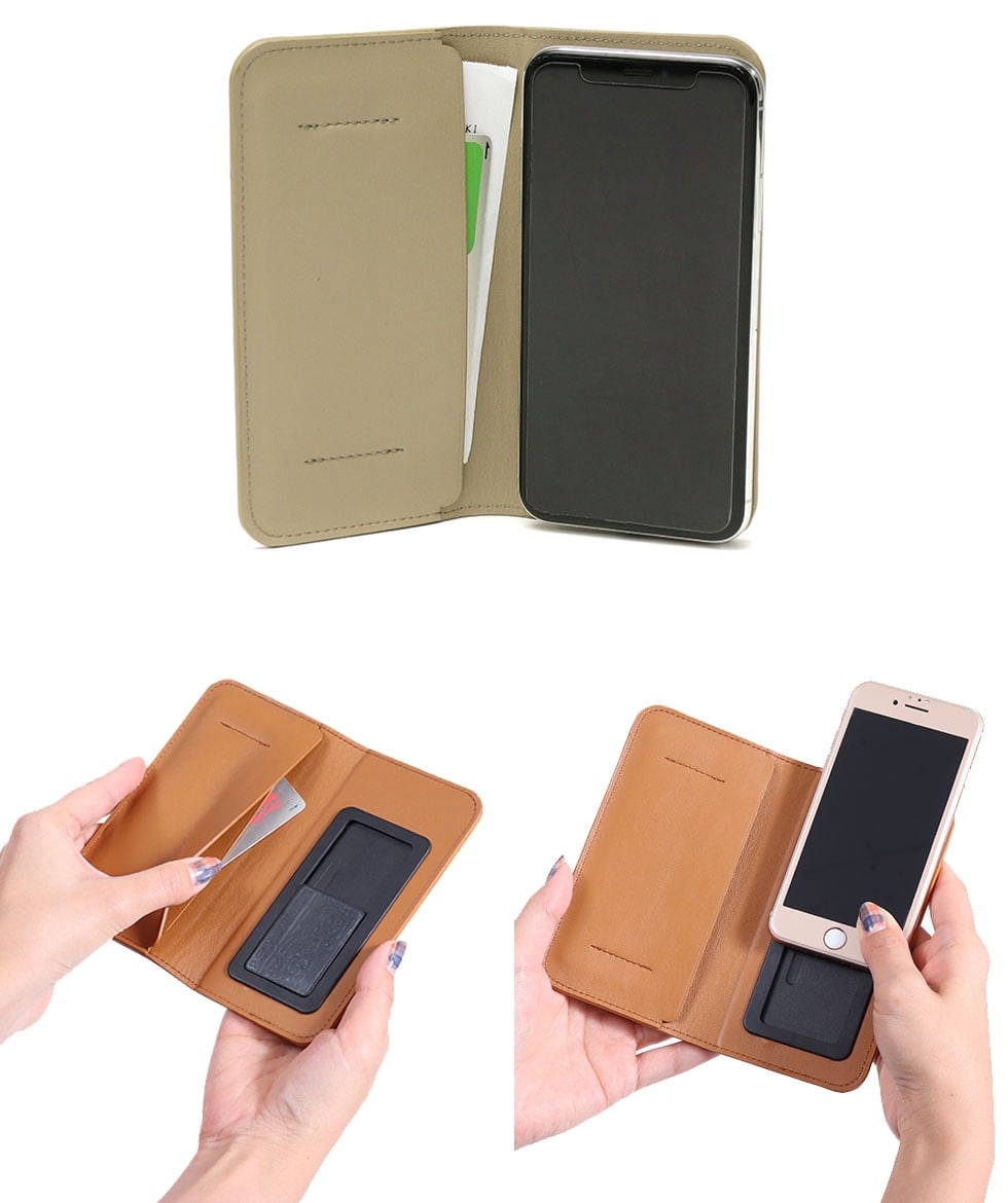 本体はiPhone Xsに対応し、スライドパーツの粘着シート部分に携帯を取り付けて使う仕様。カメラを使用する際は上にスライドさせることで撮影可能となります。左側部分にはカードや名刺が入る仕切りを付け、その後ろにはレシートなどが入るため、キャッシュレスにしたい方にもおすすめです。